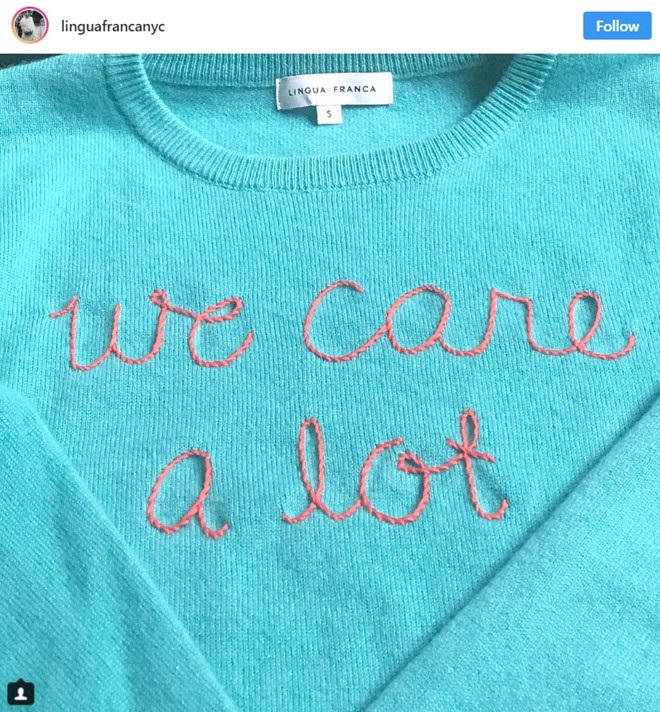Lingua Franca, nhãn hàng dệt kim của Mỹ cũng nhanh nhảu làm ra chiếc áo len được khâu bằng tay với dòng chữ "Chúng tôi quan tâm thật nhiều". Công ty này sẽ tặng 100 USD cho mỗi lần bán được một chiếc áo cho một tổ chức từ thiện tùy vào sự lựa chọn của khách hàng.