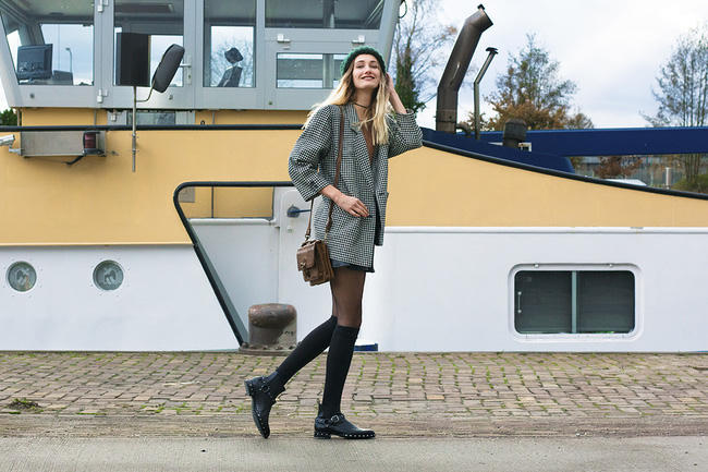 Mẹo để tạo điểm nhấn cho set đồ với blazer mỏng, chân váy của cô nàng này chính là cặp tất cao đến đầu gối.