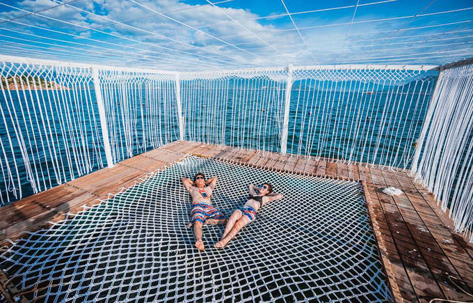 Một trong những điều hấp dẫn du khách ở đây là thiết kế lãng mạn của các khu thư giãn như xích đu trên biển, chòi phơi nắng trên bờ cát hay võng giữa biển...