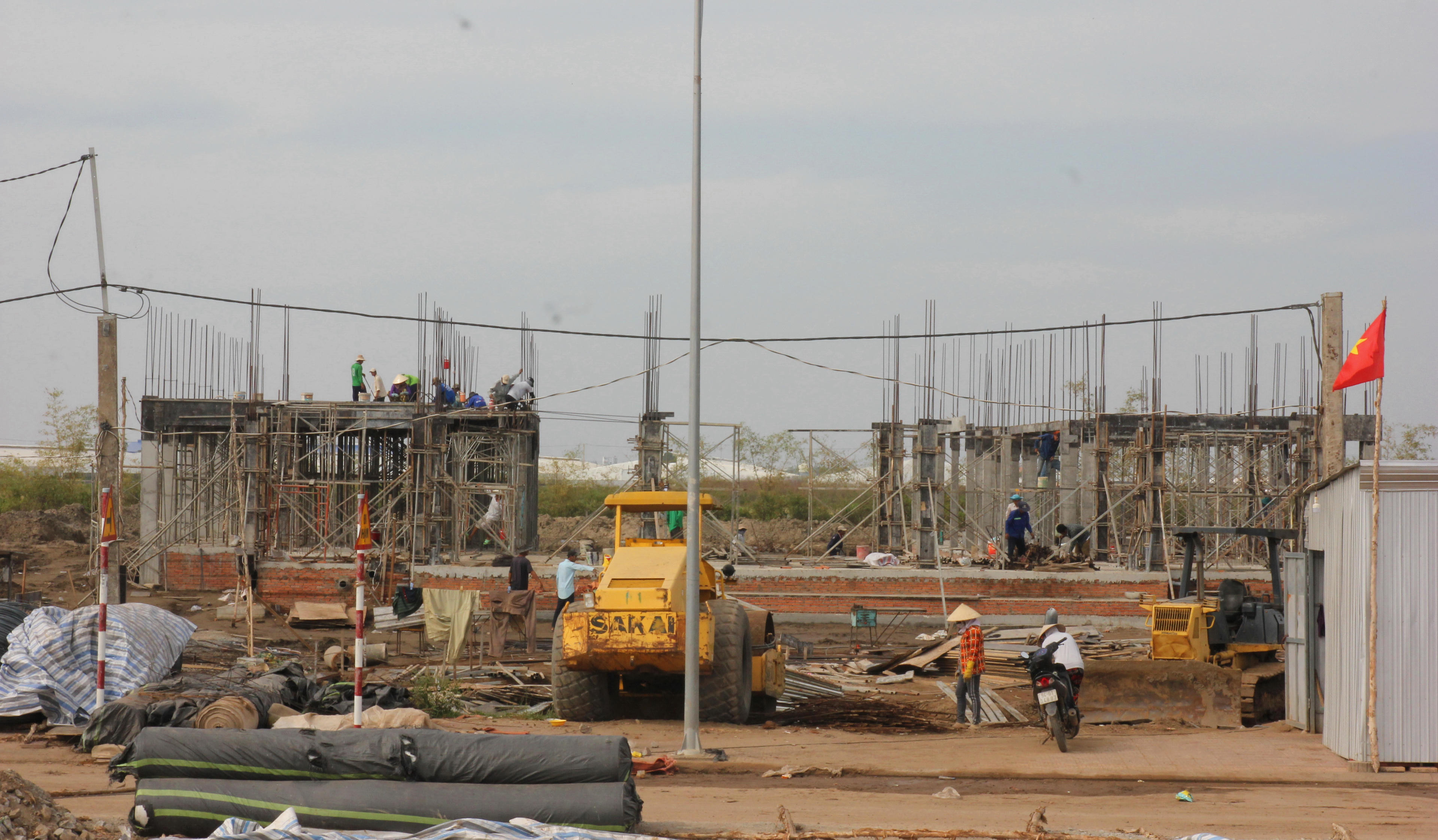 Các công nhân đang cật lực xây dựng công trình tại Khu nông nghiệp ứng dụng công nghệ cao phát triển tôm Bạc Liêu. |