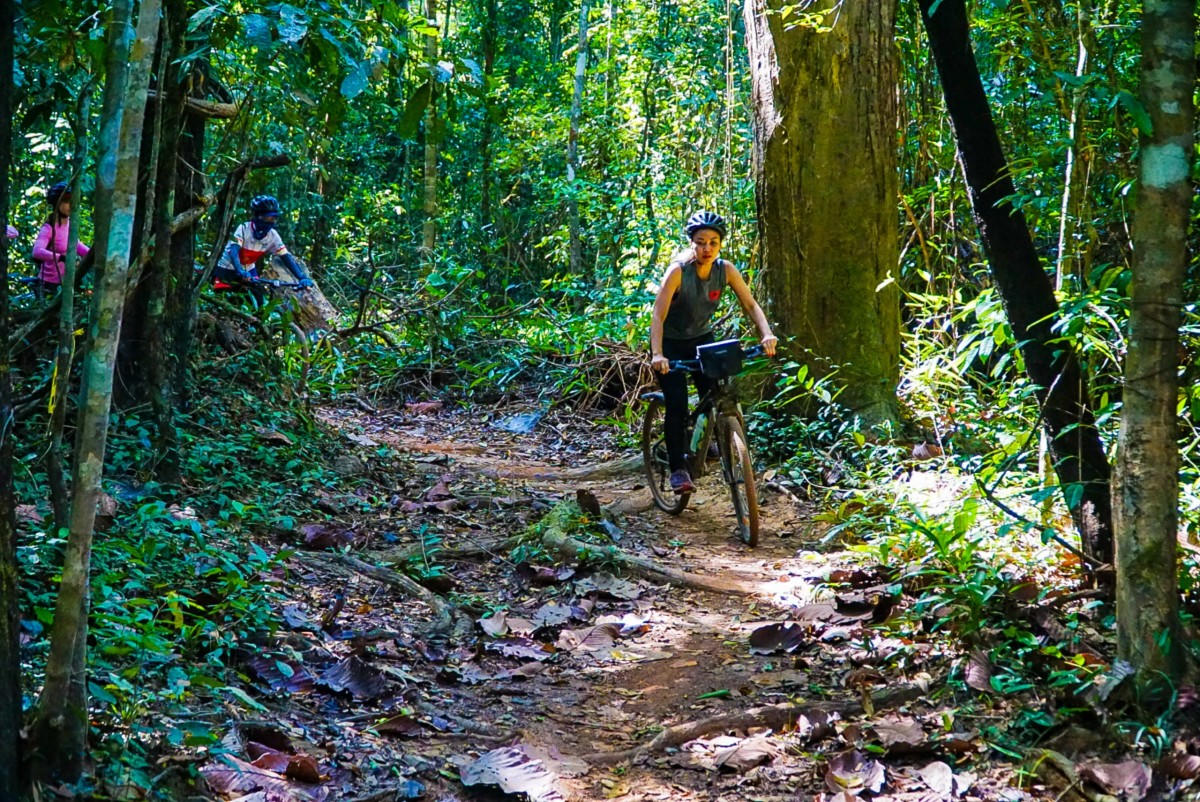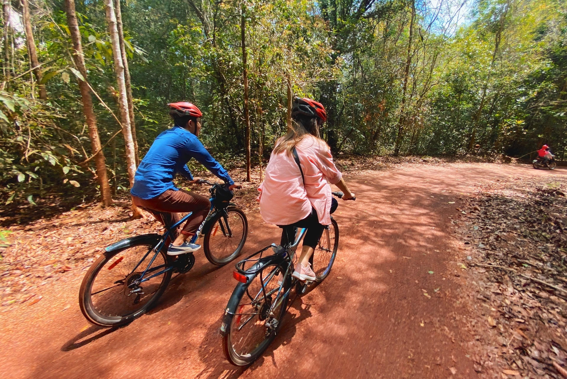 Rừng Mã Đà (Đồng Nai) cách trung tâm TP.HCM 80 km. Du khách có nhiều lựa chọn tour xe đạp, trekking với độ khó, cung đường và trải nghiệm đa dạng. Hai bên đường là rừng cây xanh mát, nên dù trời nắng gắt, không khí vẫn trong lành, mát mẻ.
