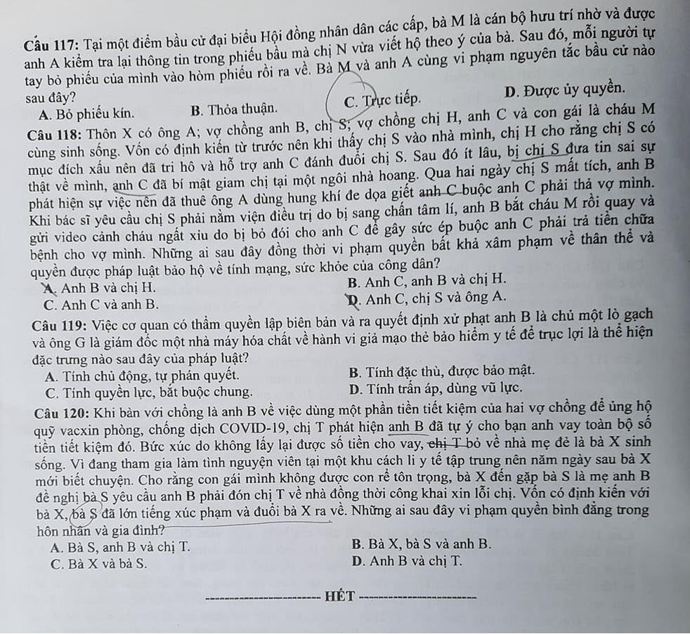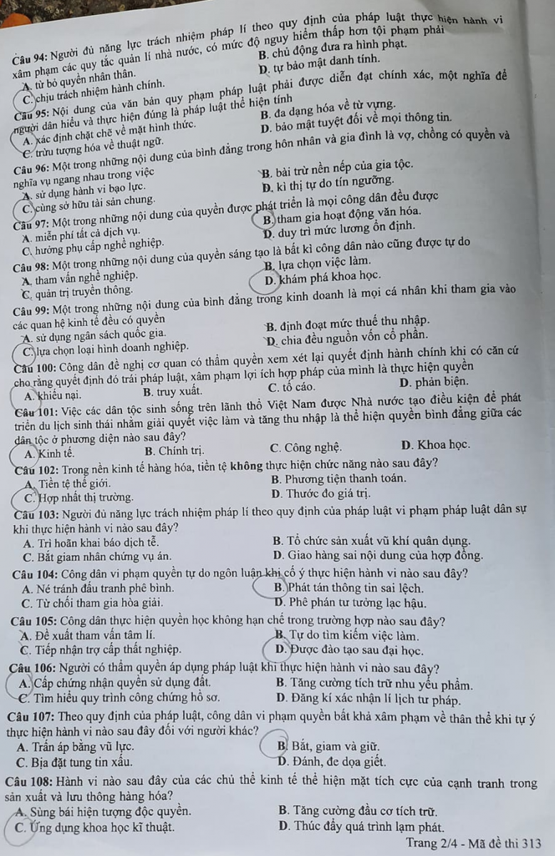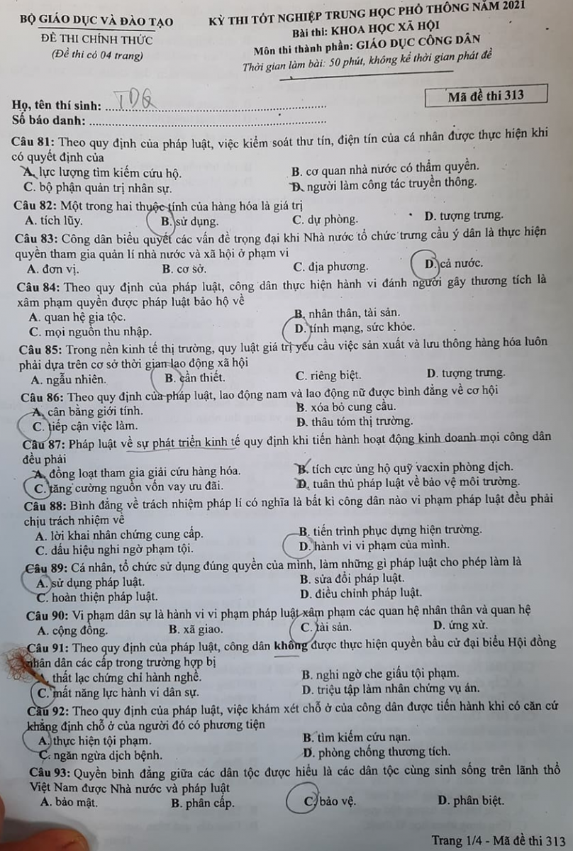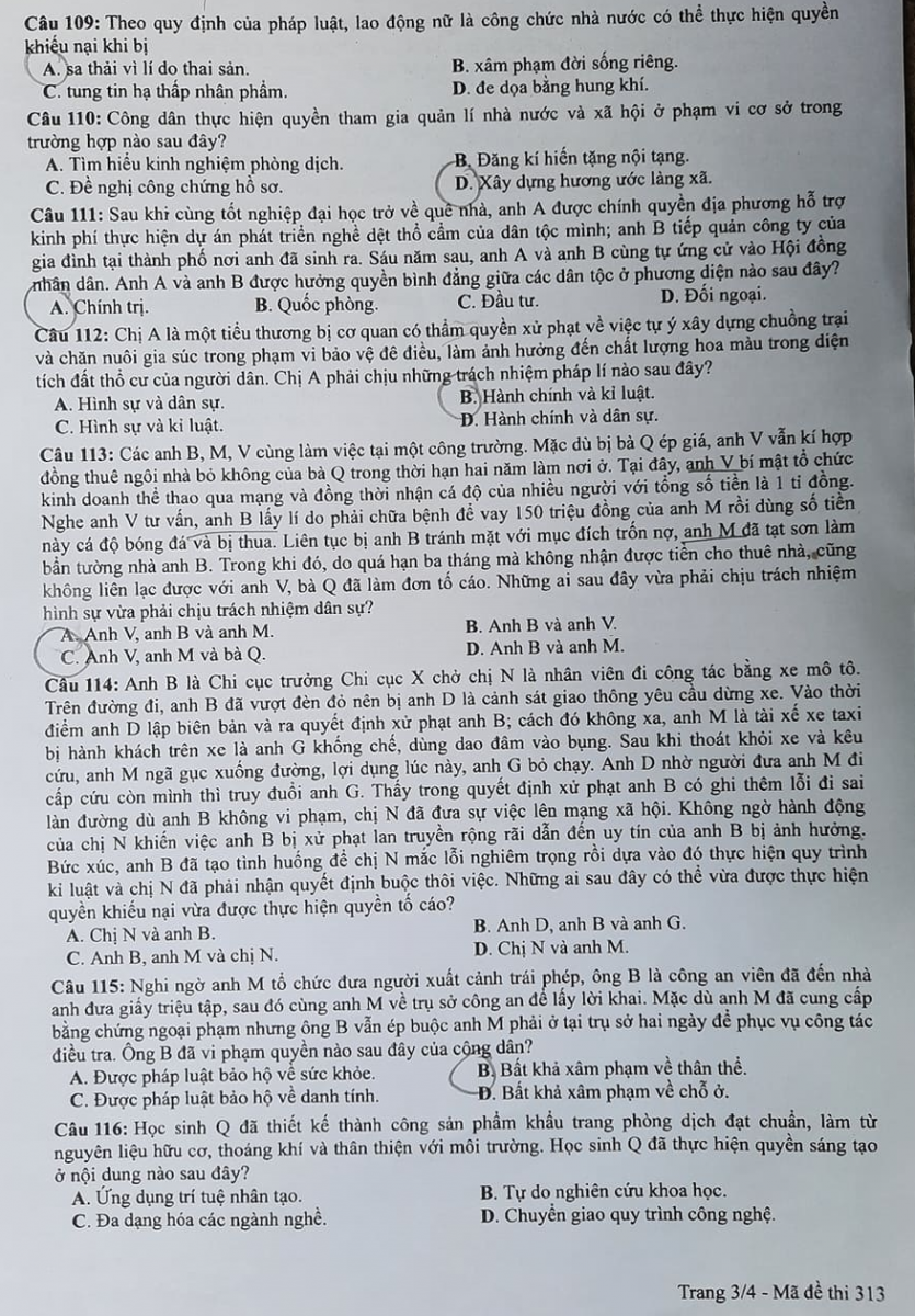 Gợi ý đáp án môn Giáo dục công dân tốt nghiệp THPT 2021 (PLVN) - Môn Giáo dục công dân là môn thi cuối cùng của tổ hợp môn Khoa học xã hội trong buổi sáng nay. Thứ Năm 08/07/2021 14:08 (GMT+7) Đề thi môn Giáo dục công dân mã đề 313 P.V