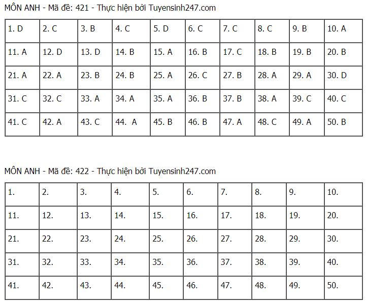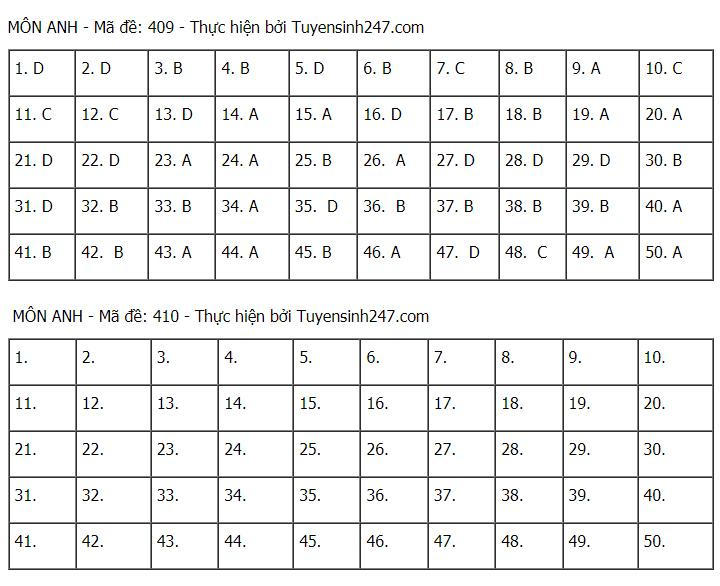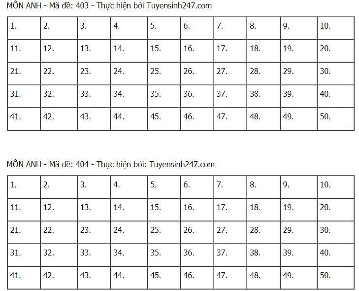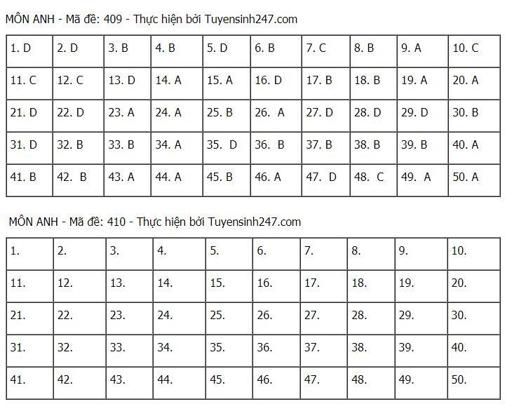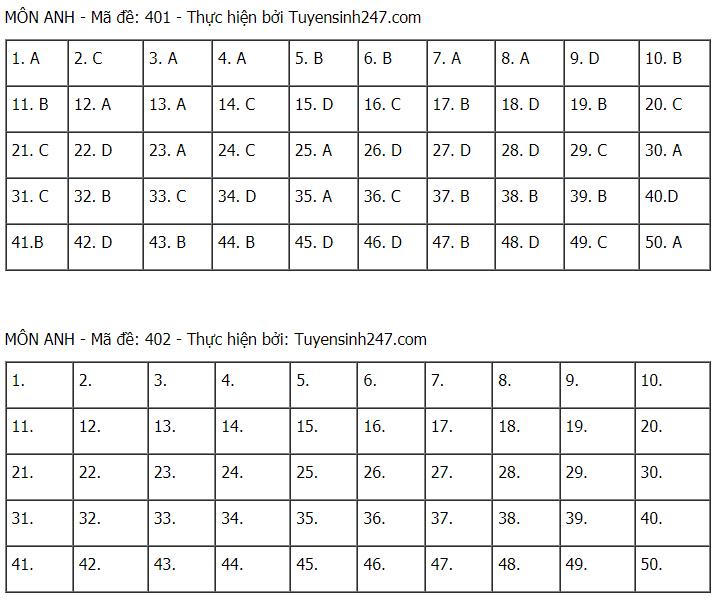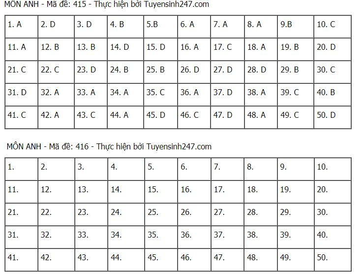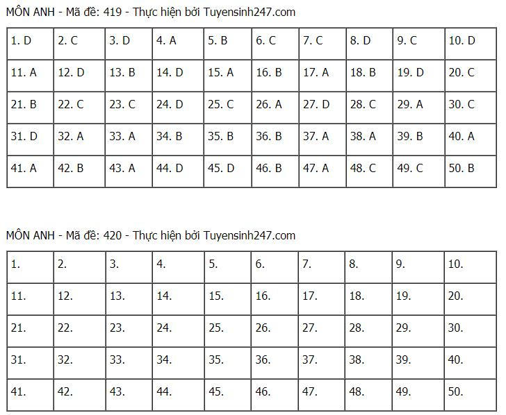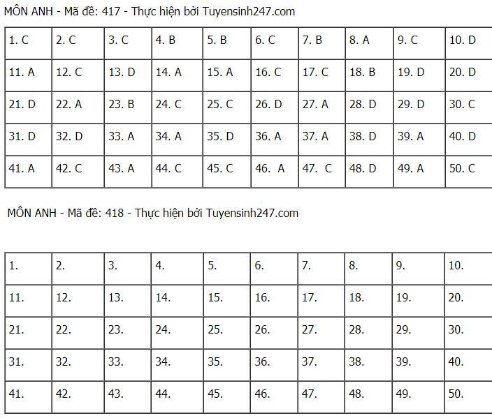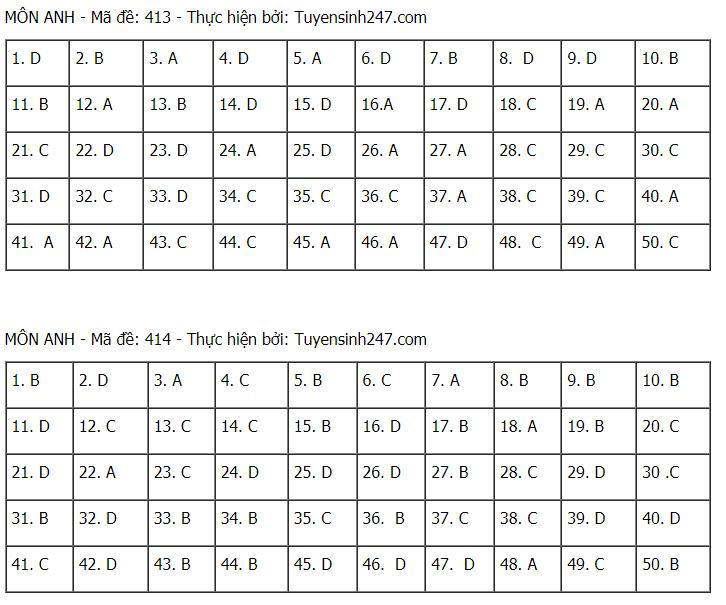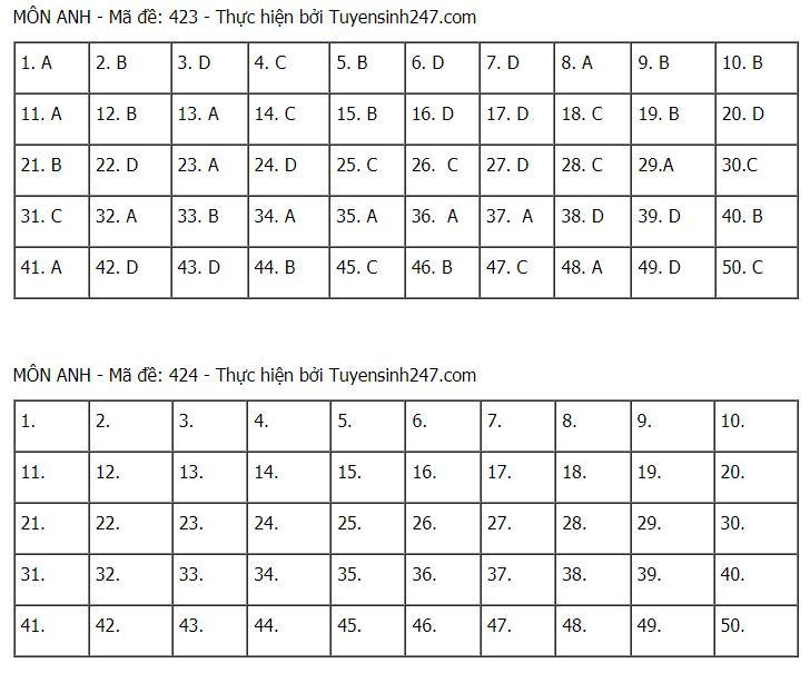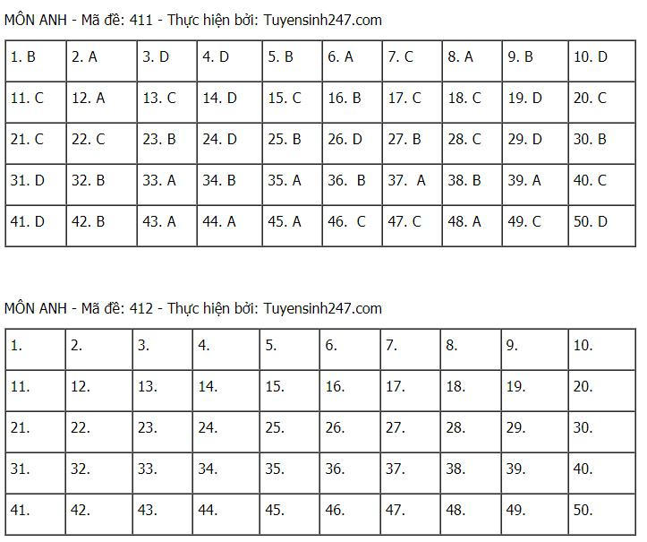 Đáp án tham khảo môn Tiếng Anh các mã đề: