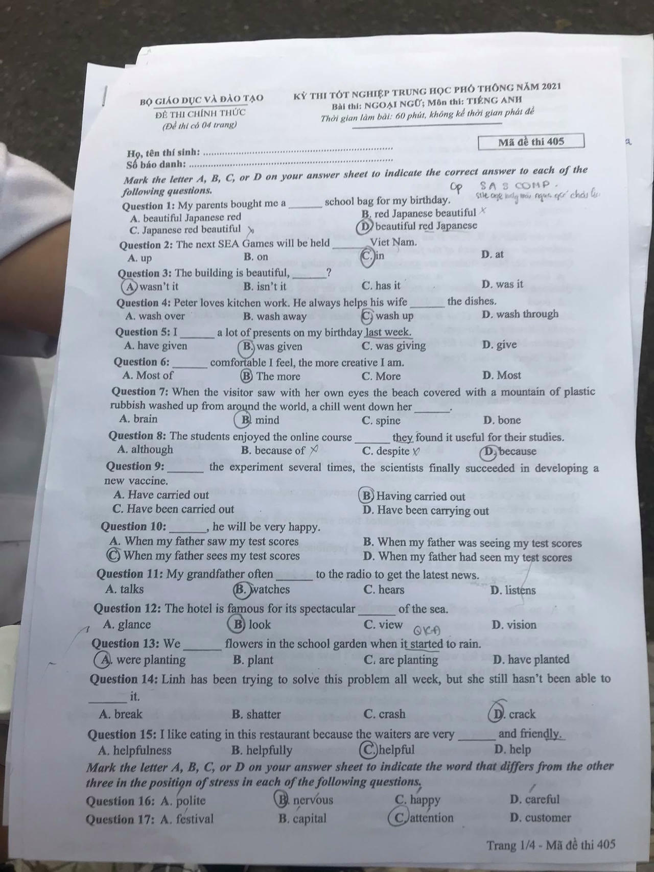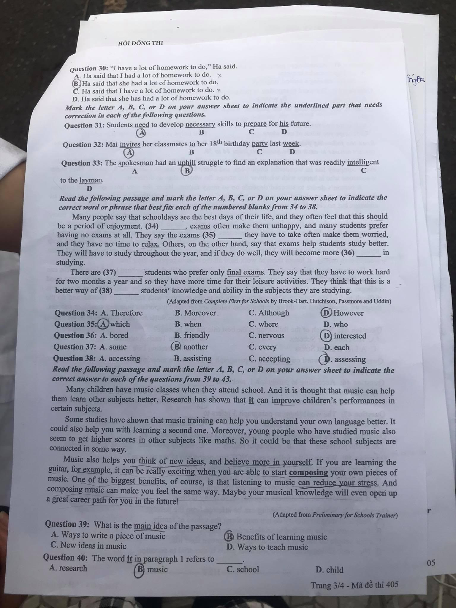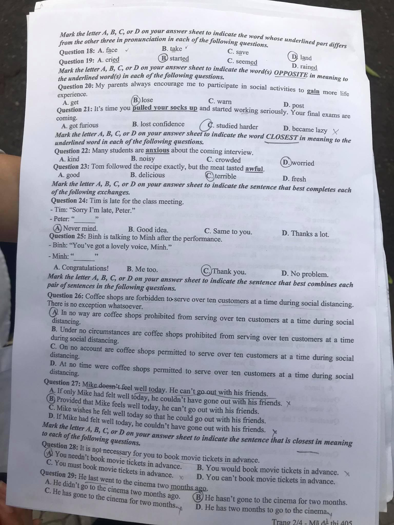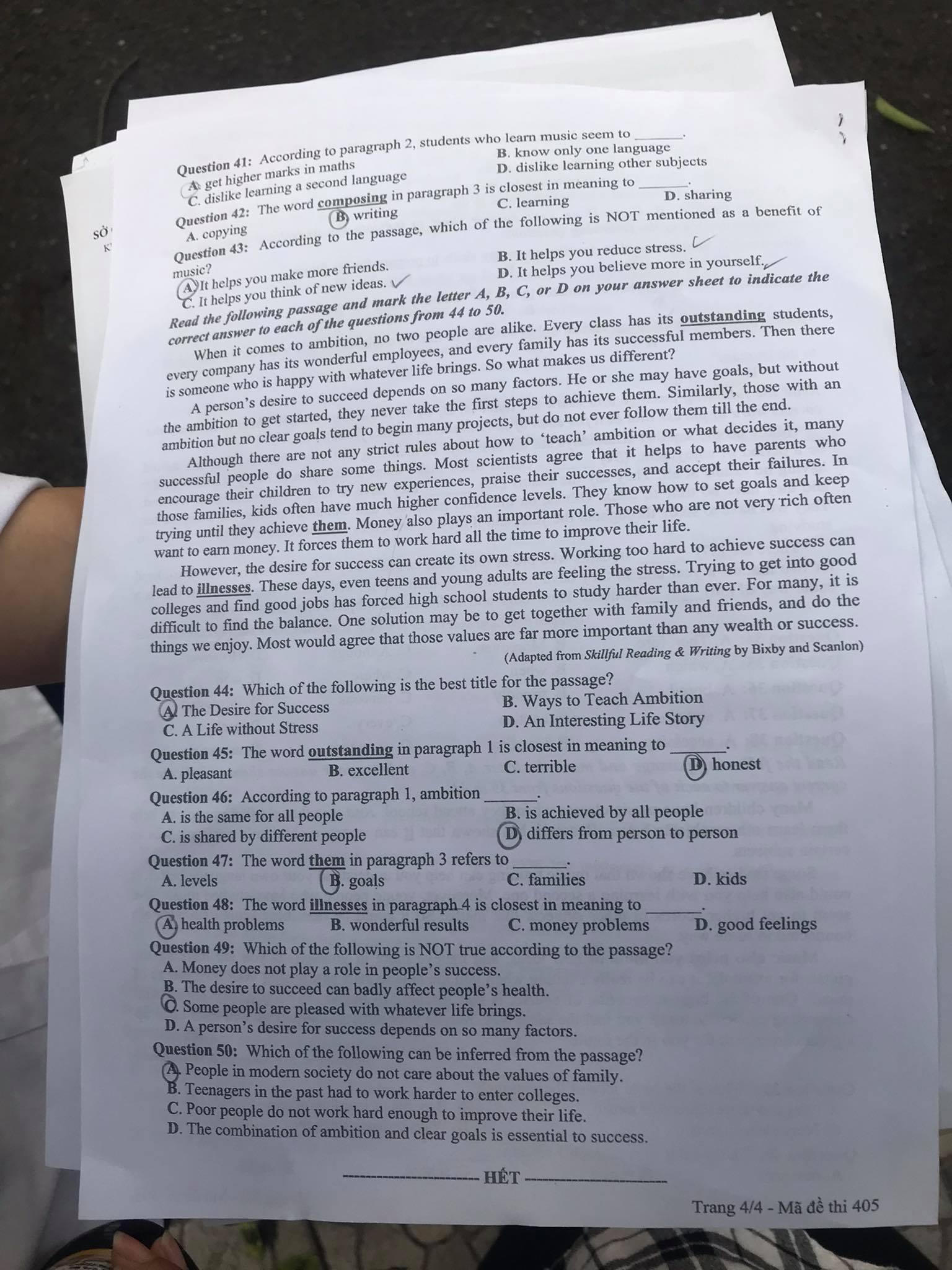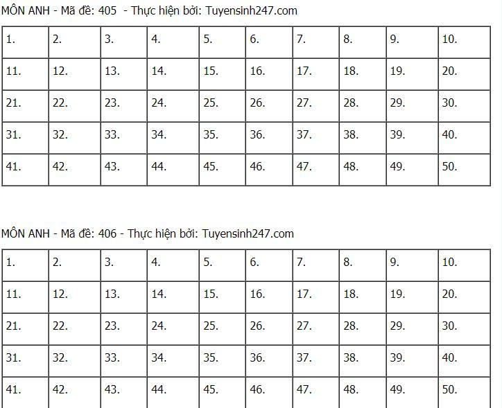 Dưới đây là đề thi môn Tiếng Anh mã đề 405