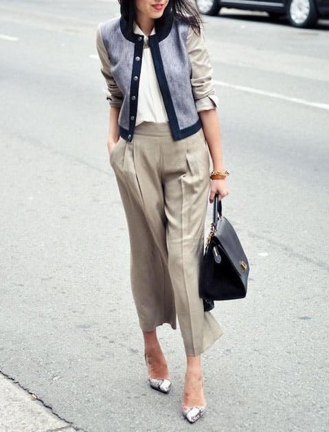 Ngoài quần jeans, chân váy bút chì, nàng công sở có thể làm phong phú style với quần ống rộng thanh lịch. Dáng quần ống rộng giúp bạn che đi nhiều nhược điểm chân cong, to và phù hợp với mọi dáng người. Kết hợp quần ống suông với chiếc áo sơ mi hay áo len giúp bạn trông thật sành điệu, cá tính.