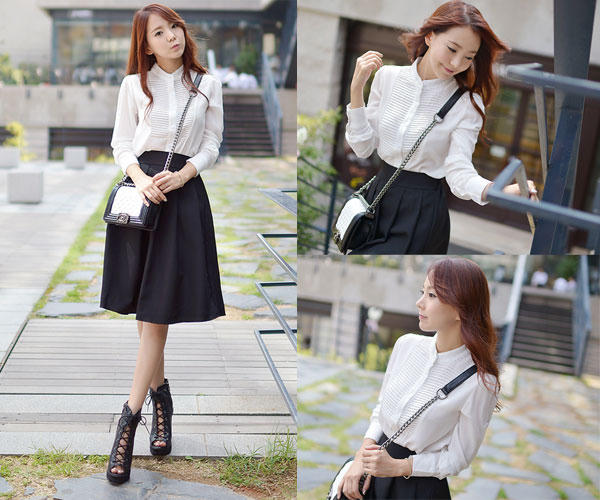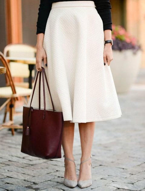 Với kiểu dáng bồng bềnh và ngọt ngào, váy midi rất được lòng phái đẹp. Váy midi làm cho bộ trang phục công sở trở nên hoàn hảo, nghiêm túc mà không kém phần quyến rũ, dịu dàng. Bạn có thể tha hồ mix cùng nhiều trang phục khác nhau như áo sơ mi, áo thun, áo len mỏng, cardigan.