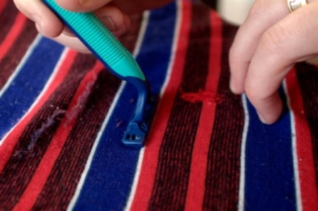 Sử dụng dao cạo râu để loại bỏ các bụi bẩn trên mặt quần áo: Bạn có thể sử dụng dao cạo râu hoặc dao lam, lướt nhẹ trên mặt vải để bụi bẩn không còn bám trên bề mặt áo quần.