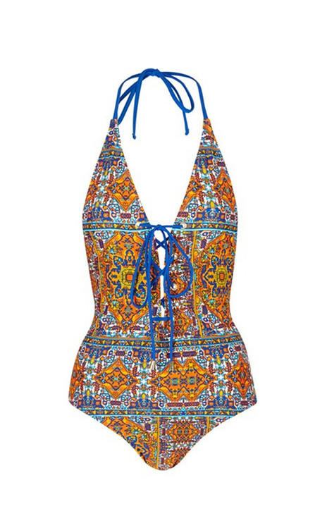 Nếu muốn “kín đáo” một chút nhưng vẫn có điểm nhấn, hãy chọn bộ đồ bơi họa tiết boho này của hãng thời trang Topshop. Bộ đồ này có giá là 60 USD.