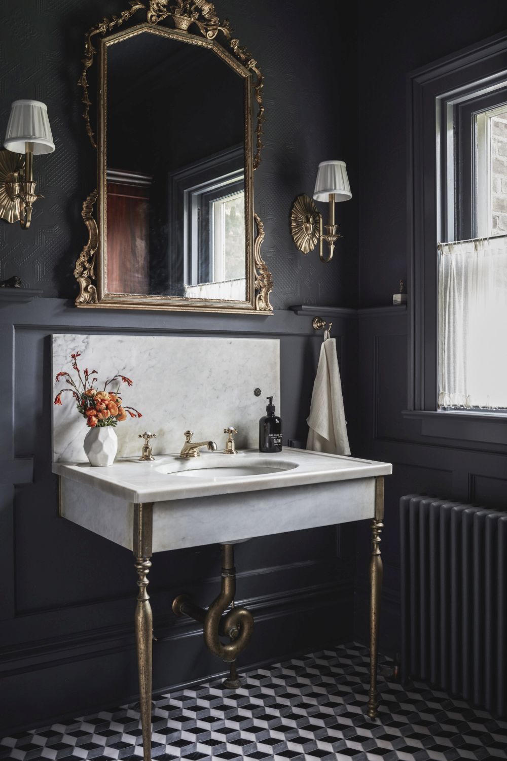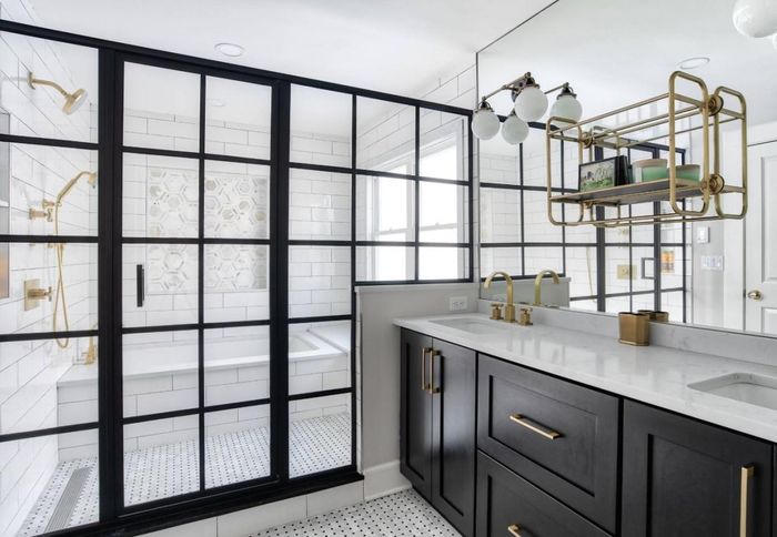 Có nhiều cách khác nhau để trang trí phòng tắm với hai màu trắng đen. Gia chủ có thể chọn gạch hình họa tiết cho sàn và tường nhà. Ngoài ra cũng có thể thử các mẫu gạch cổ điển.