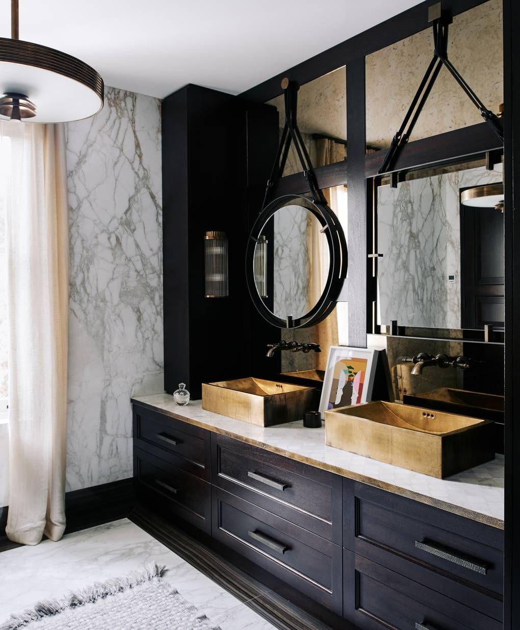 Gia chủ cũng có thể sử dụng các điểm nhấn bằng kim loại màu vàng giúp phòng tắm cá tính hơn và không bị nhàm chán vì chỉ sử dụng 2 màu đen và trắng.