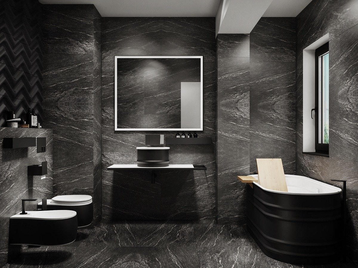 Nếu gia chủ là một người phong cách thì việc thiết kế bồn tắm màu đen bên ngoài và bên trong màu trắng cũng khá thú vị. Đây là sự kết hợp thanh lịch và sang trọng, thống nhất với phần còn lại của không gian.