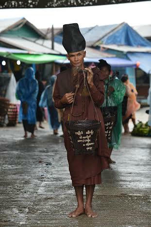 ...Sớm hôm sau, đoàn chia thành hai nhóm, một tiếp tục quay lại Golden Rock đón bình minh trong mưa, một xuống trung tâm thị trấn ngắm nghía cuộc sống của người dân bản địa. Tôi theo đoàn thứ hai, thấy mình như đi ngang qua bình yên, gặp lại cảnh thật quen ở vùng núi quê nhà, những người phụ nữ đứng bán trái cây (chủ yếu là chuối và cam quýt), đám trẻ quây quanh một chảo bánh rán xôi xèo xèo và những đoàn thầy tu đi khất thực với màu áo nâu sồng (nam), hồng phấn (nữ) sinh động như một bức tranh đẹp về cuộc sống.