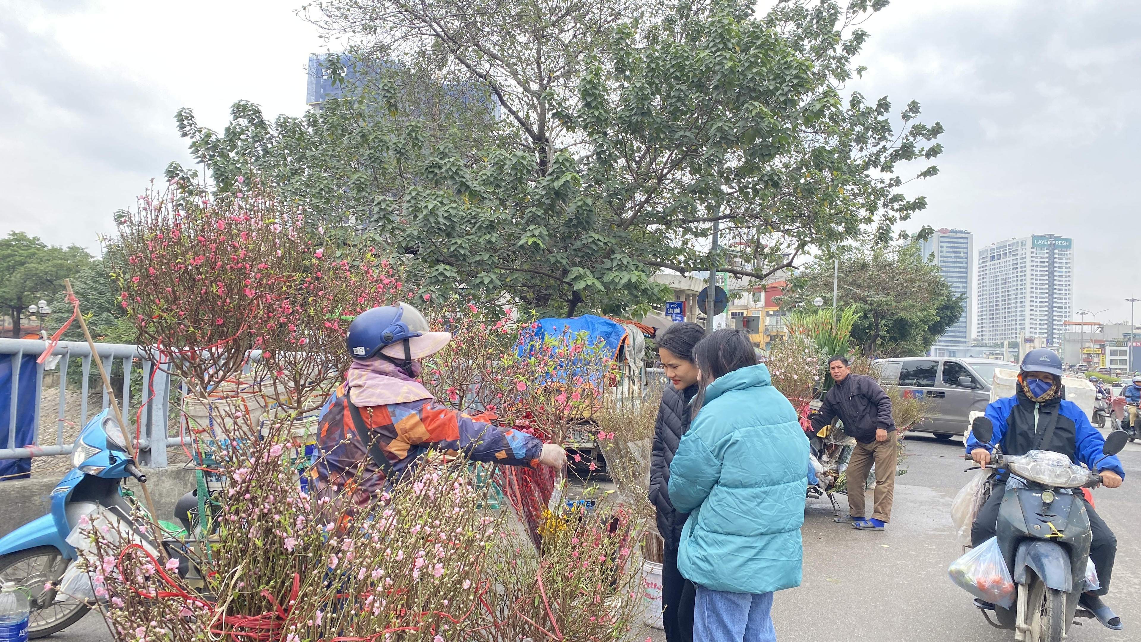 Khách đứng co ro chọn mua đào tại chợ Ngã Tư Sở.