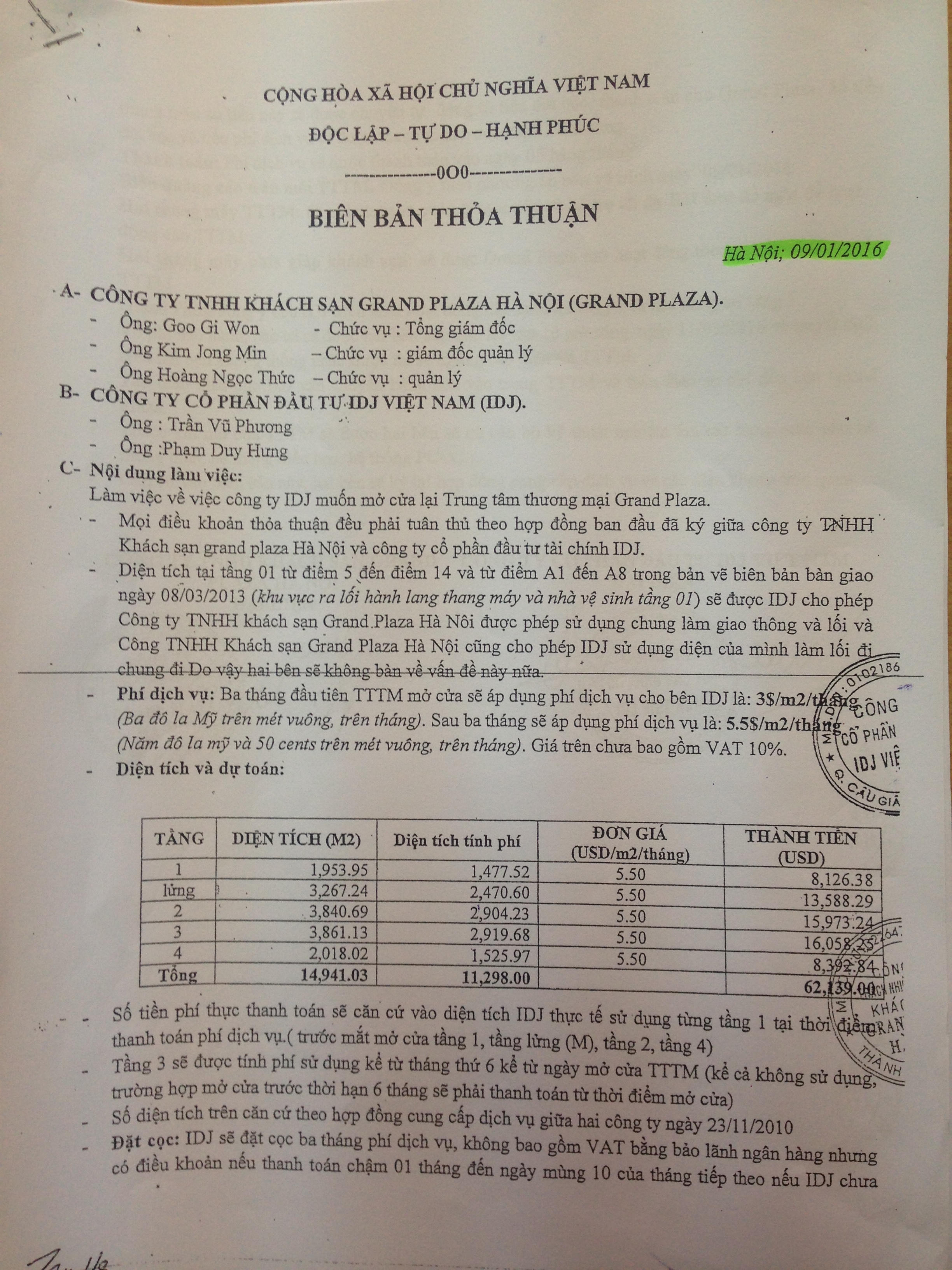“Tiều xảo” này, theo phản ánh của IDJ là một Biên bản thỏa thuận được ký ngày 9/1/2016 giữa Tổng Giám đốc Công ty TNHH khách sạn Grand Plaza Hà Nội với 2 nhân viên không có chức danh, không được ủy quyền, không phải là người theo đại diện theo pháp luật của IDJ.