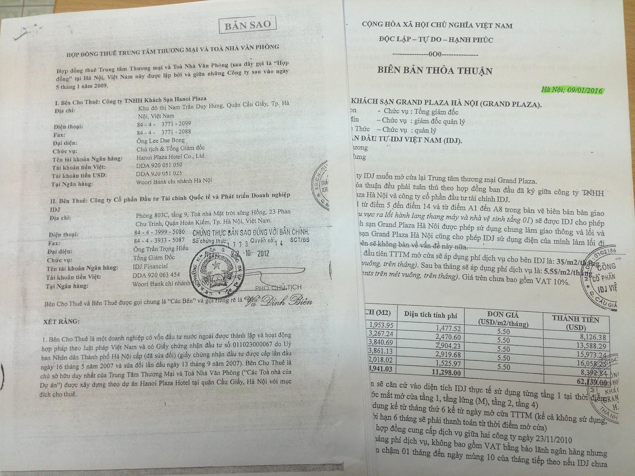 Đỉnh điểm của việc này, theo phản ánh của Công ty IDJ là một Biên bản thỏa thuận được ký ngày 9/1/2016 giữa Tổng Giám đốc Công ty TNHH khách sạn Grand Plaza Hà Nội với 2 nhân viên của IDJ với nhiều điều khoản, trong đó có việc cho phép Grand Plaza sử dụng chung diện tích hành lang mà IDJ đã thuê.