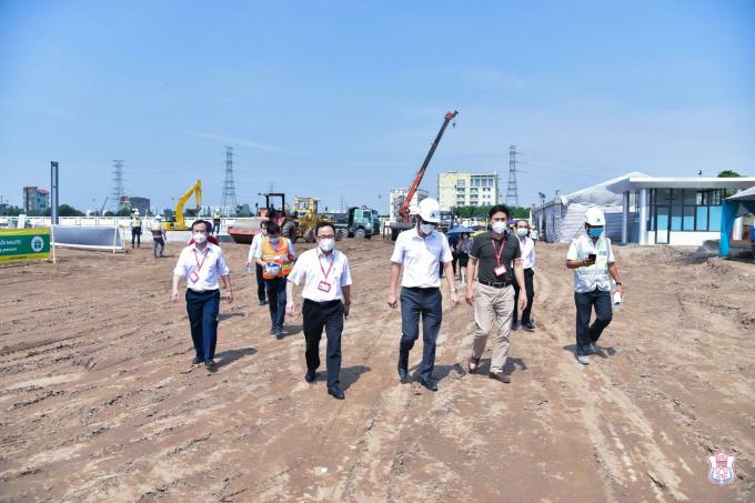 Ban giám hiệu Trường Đại học Y Hà Nội kiểm tra tiến độ xây dựng Bệnh viện dã chiến hồi sức tích cực COVID-19.