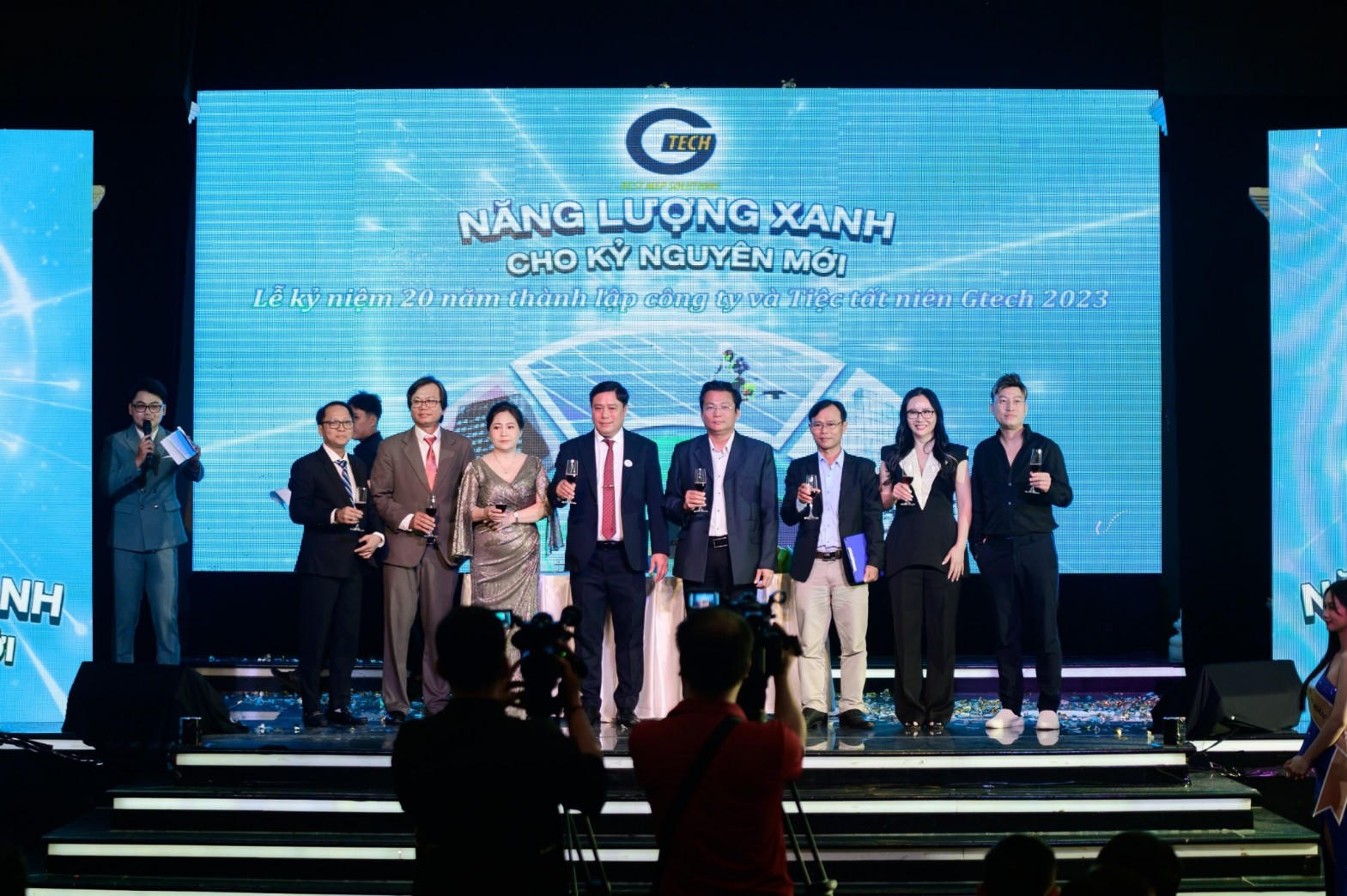 Các lãnh đạo của Công ty Cổ phần Kỹ nghệ Toàn Cầu nâng ly nhân "sinh nhật 20 năm của gia đình Gtech". |