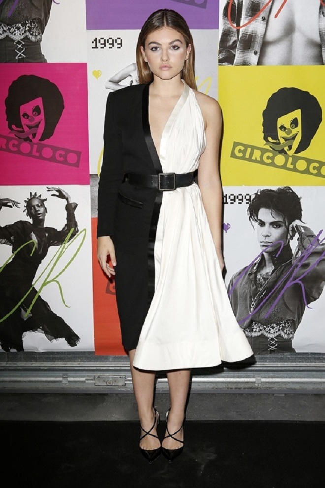 Vẻ sang trọng, phá cách vừa phải của Thylane trong bộ váy lụa cao cấp đơn sắc bất đối xứng, nhấn bằng thắt lưng da.