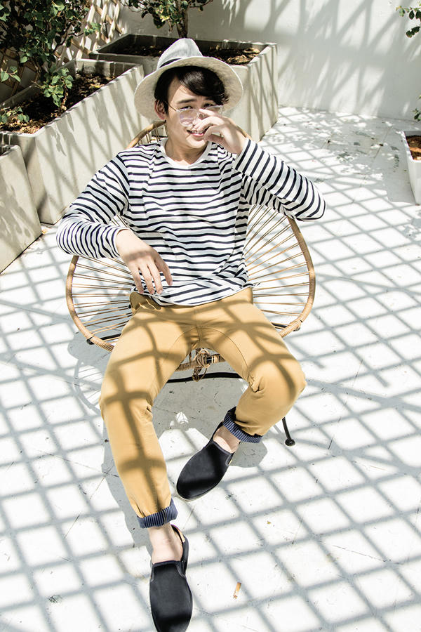 'Chán' mốt quần lửng năng động, cá tính, Quang Bảo lựa chọn quần dài được xắn gấu, phối cùng áo thun sọc, đi kèm là mũ nồi.
