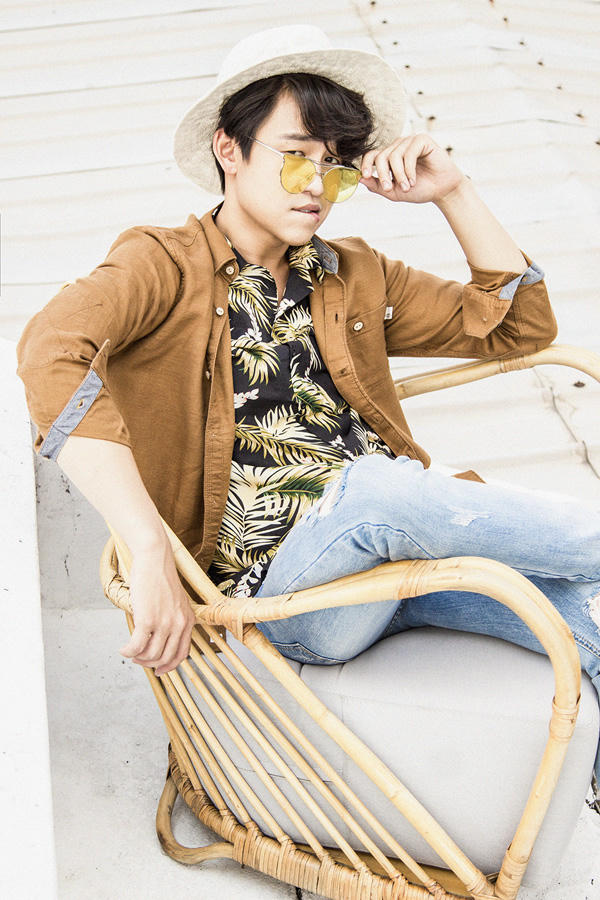 Quang Bảo trở thành chàng trai mùa hè chính hiệu với áo sơ mi họa tiết hoa lá, áo khoác ngoài tông màu da bò đi kèm quần jean rách 'bụi'.