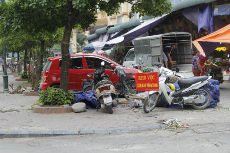 Tại Phố Trần Hưng Đạo, hiện tượng hàng hóa, xe cộ xếp đầy trên vỉa hè, góc giao với đường Bà Triệu, Ban quản lý chợ Hà Đông tự ý quây thành điểm trông giữ xe máy ngay trên vỉa hè.