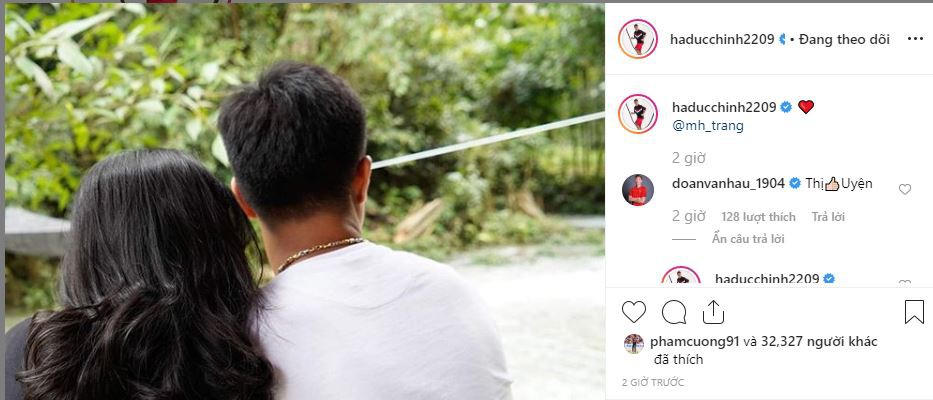 Cầu thủ người Phú Thọ đăng một bức ảnh chụp từ phía sau lưng ghi lại giây phút anh chàng ngồi thân mật bên một cô gái kèm theo một biểu tượng trái tim màu đỏ và tag nick Instagram của bạn gái. Động thái này như một lời xác nhận Đức Chinh cùng Mai Hà Trang hiện đang hẹn hò.
