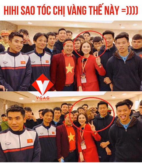 Khi một fan nữ tới xin chụp ảnh cùng toàn đội, Đức Chinh nghịch ngợm cầm tóc cô gái với biểu cảm hài hước.