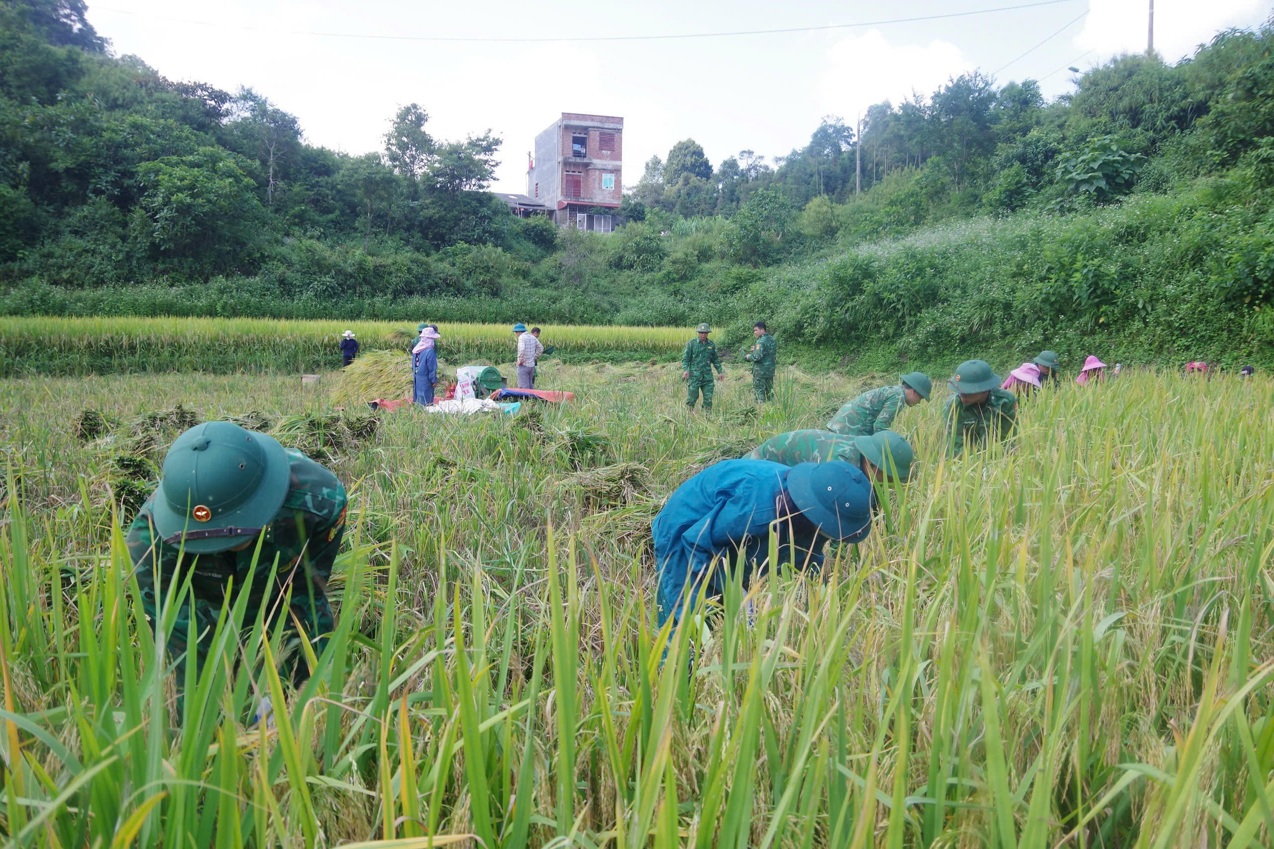Hà Giang: Đồn Biên phòng Sơn Vĩ xuống đồng giúp dân thu hoạch lúa sau mưa bão
