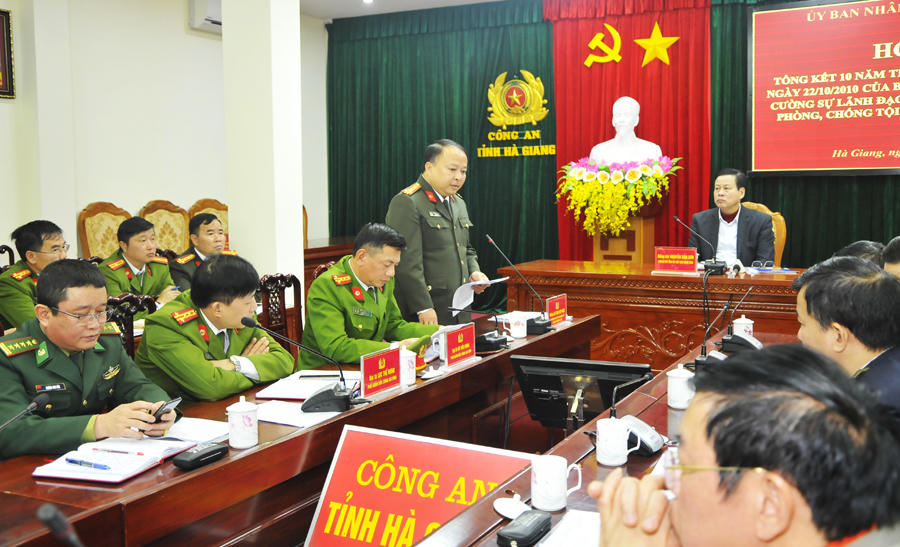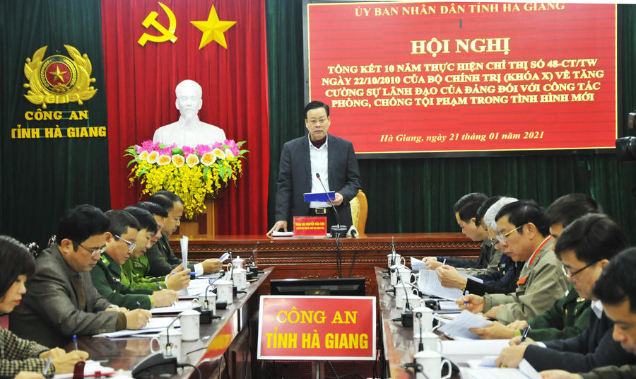 Ngày 21/1, tại Công an tỉnh, UBND tỉnh Hà Giang tổ chức Hội nghị trực tuyến với các huyện, thành phố, tổng kết 10 năm thực hiện Chỉ thị số 48-CT/TW của Bộ Chính trị (khóa X) về tăng cường sự lãnh đạo của Đảng đối với công tác phòng, chống tội phạm (PCTP) trong tình hình mới.