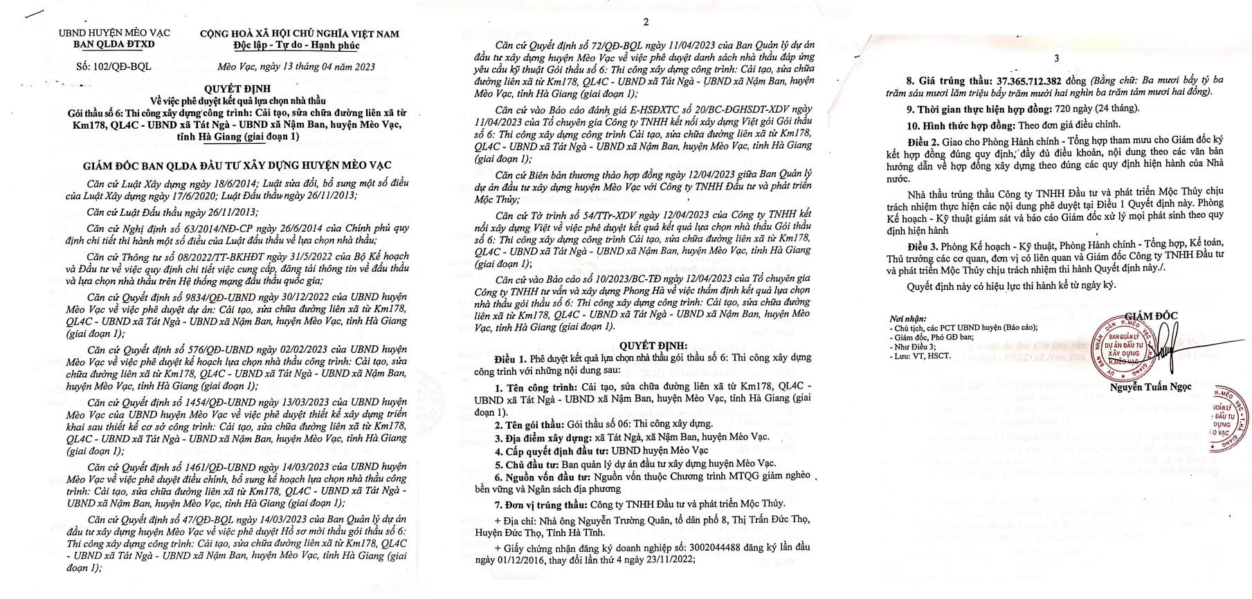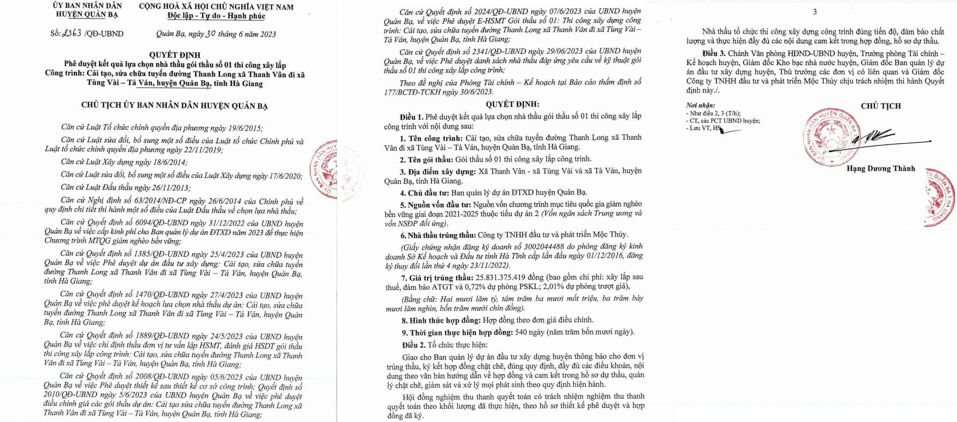 Sau đó 2 ngày, ngày 30/6/2023, Chủ tịch UBND huyện Quản Bạ tiếp tục phê duyệt cho Công ty Mộc Thủy trúng Gói thầu số 01: Thi công xây lắp, công trình cải tạo, sửa chữa tuyến đường Thanh Long xã Thanh Vân đi xã Tùng Vài – Tả Ván, huyện Quản Bạ, tỉnh Hà Giang do Ban quản lý dự án đầu tư xây dựng huyện Quản Bạ làm chủ đầu tư. Giá gói thầu: 25.855.811.930 đồng, giá trúng thầu: 25.831.375.419 đồng, gói thầu gần 26 tỷ đồng tiết kiệm cho ngân sách gần 25 triệu đồng.
