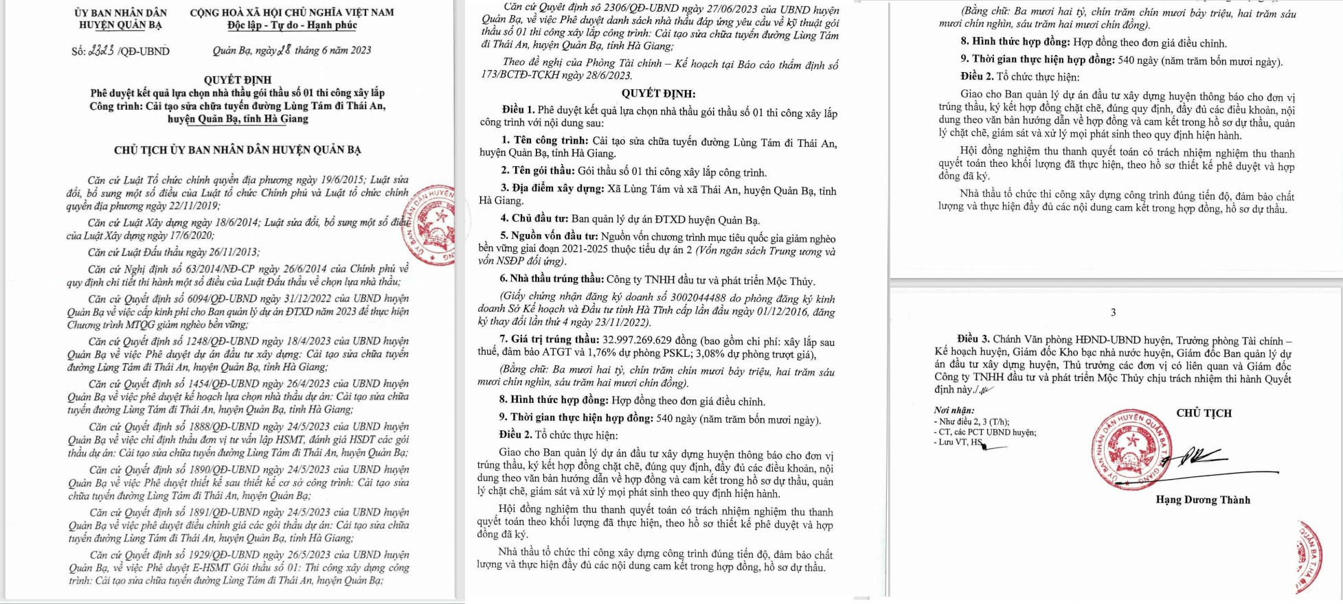 Ngày 28/6/2023 Chủ tịch UBND huyện Quản Bạ đã phê duyệt cho Công ty Mộc Thủy trúng Gói thầu số 01: Thi công xây lắp, công trình cải tạo, sửa chữa tuyến đường Lùng Tám đi Thái An, huyện Quản Bạ, tỉnh Hà Giang do Ban quản lý dự án đầu tư xây dựng huyện Quản Bạ làm chủ đầu tư. Giá gói thầu 33.034.140.666 đồng, giá trúng thầu 32.997.269.629 đồng, tiết kiệm khoảng 37 triệu đồng cho ngân sách.