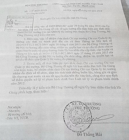 Tiếp đó, ngày 23/1/2018, mặc dù Bộ Công thương đã có công văn số 618/BCT – TCCB gửi UBND tỉnh Hà Giang để trả lời về công văn số 189/UBND – NC ngày 19/1/2018 của UBND tỉnh Hà Giang về việc đề nghị hướng dẫn thực hiện quy định chức danh Chi cục trưởng Chi cục QLTT trực thuộc Sở Công thương, tại công văn này nêu rõ việc bổ nhiệm Chi Cục trưởng Chi Cục QLTT phải thực hiện theo Thông tư liên tịch số 34/TTLT – BCT – BNV ngày 27/10/2015 của liên Bộ Công thương – Bộ Nội vụ…: “Chi Cục trưởng Chi Cục QLTT phải đồng thời là Phó Giám đốc Sở Công thương”, thế nhưng ông Quyền vẫn kí quyết định bổ nhiệm ông Vũ Quốc Khánh giữ chức Chi cục trưởng Chi Cục QLTT là làm trái với quy định.
