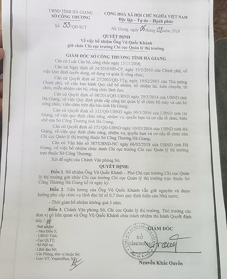 Cũng theo phản ánh đến Báo PLVN, ngày 6/2/2018 vừa qua, ông Nguyễn Khắc Quyền – Giám đốc Sở Công thương tỉnh Hà Giang đã “vội vàng” ký Quyết định số 33/QĐ – SCT bổ nhiệm ông Vũ Quốc Khánh – Phó Chi Cục trưởng Chi Cục QLTT tỉnh Hà Giang giữ chức vụ Chi cục trưởng Chi cục QLTT tỉnh Hà Giang (nhưng không đồng thời là Phó Giám đốc Sở Công thương) với mức phụ cấp 0,7 mà không tuân thủ theo các quy định của pháp luật.