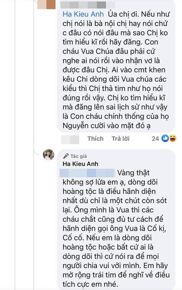 "Vàng thật không sợ lửa, dòng dõi hoàng tộc là điều hãnh diện nhất dù chỉ là một chút còn sót lại… Dòng dõi nhà chị là vua chúa thật, một số điểm em nêu ra về tên gọi có thể chị nghe các cậu mợ kể lại, gia phả ghi chép có sai sót, em đính chính chị cảm ơn em nhiều. Còn câu chuyện chị viết về gia đình chị là có thật”, Hà Kiều Anh cho biết.