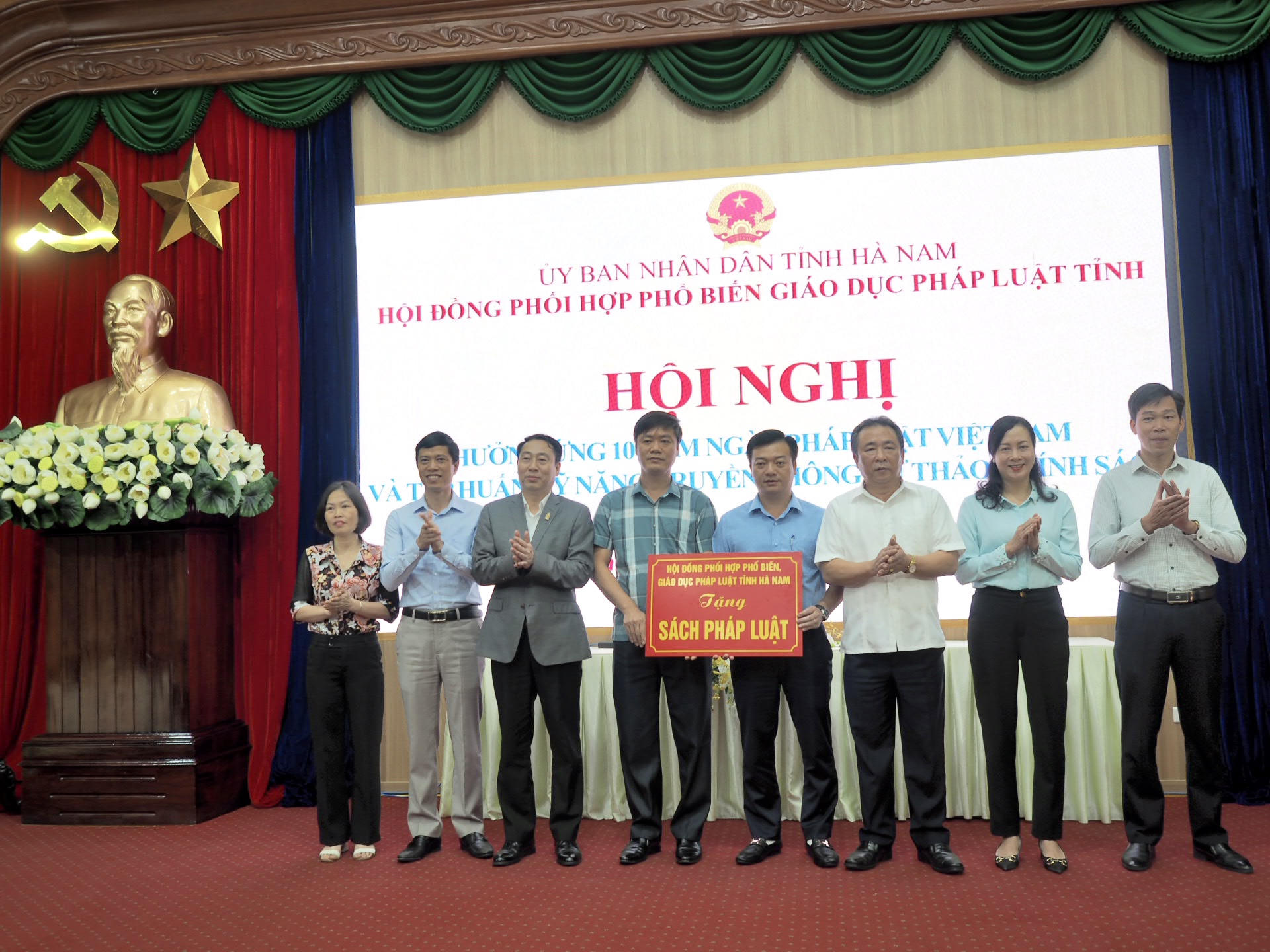 Hưởng ứng Ngày Pháp luật Việt Nam năm 2022 và nhằm góp phần hỗ trợ tài liệu pháp luật cho các mô hình điển hình về Phổ biến, giáo dục pháp luật; hòa giải ở cơ sở tại các xã đăng ký xây dựng nông thôn mới nâng cao và góp phần đa dạng hơn các tài liệu pháp luật của các thư viện Nhà trường để phục vụ nhu cầu tìm hiểu pháp luật của giáo viên, học sinh. Hội đồng phối hợp PBGDPL tỉnh Hà Nam tổ chức trao tặng sách pháp luật cho 13 xã đăng ký xây dựng nông thôn mới nâng cao và 02 trường THPT trên địa bàn thành phố Phủ Lý.