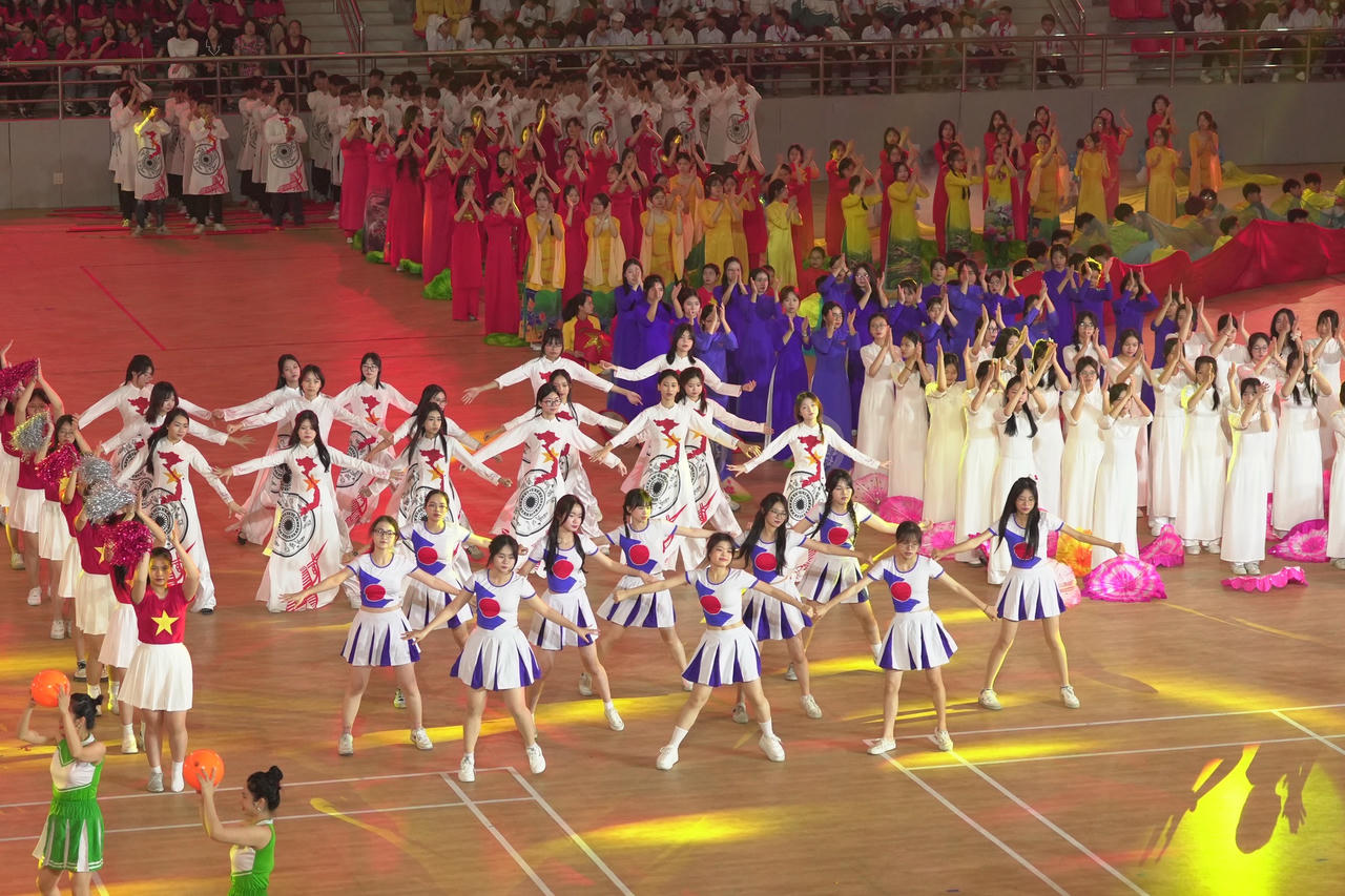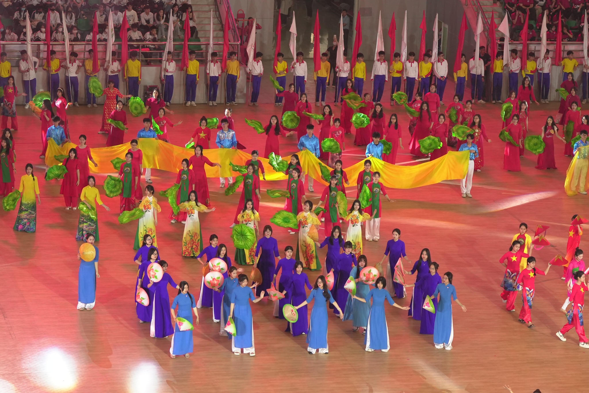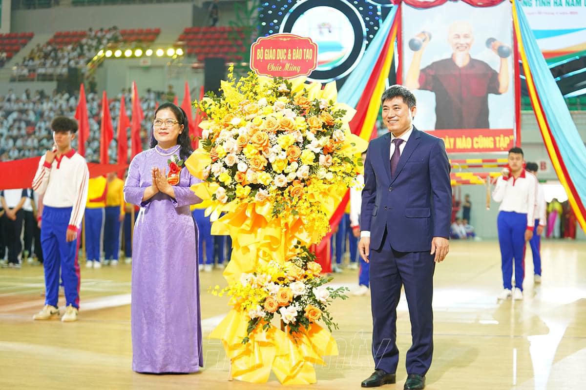 Thứ trưởng Bộ Giáo dục và Đào tạo Nguyễn Thị Kim Chi và ông Trần Xuân Dưỡng, Phó Chủ tịch UBND tỉnh, Trưởng Ban Tổ chức Hội khỏe Phù Đổng tỉnh lần thứ VII tặng hoa và trao cờ lưu niệm cho các đoàn tham dự.