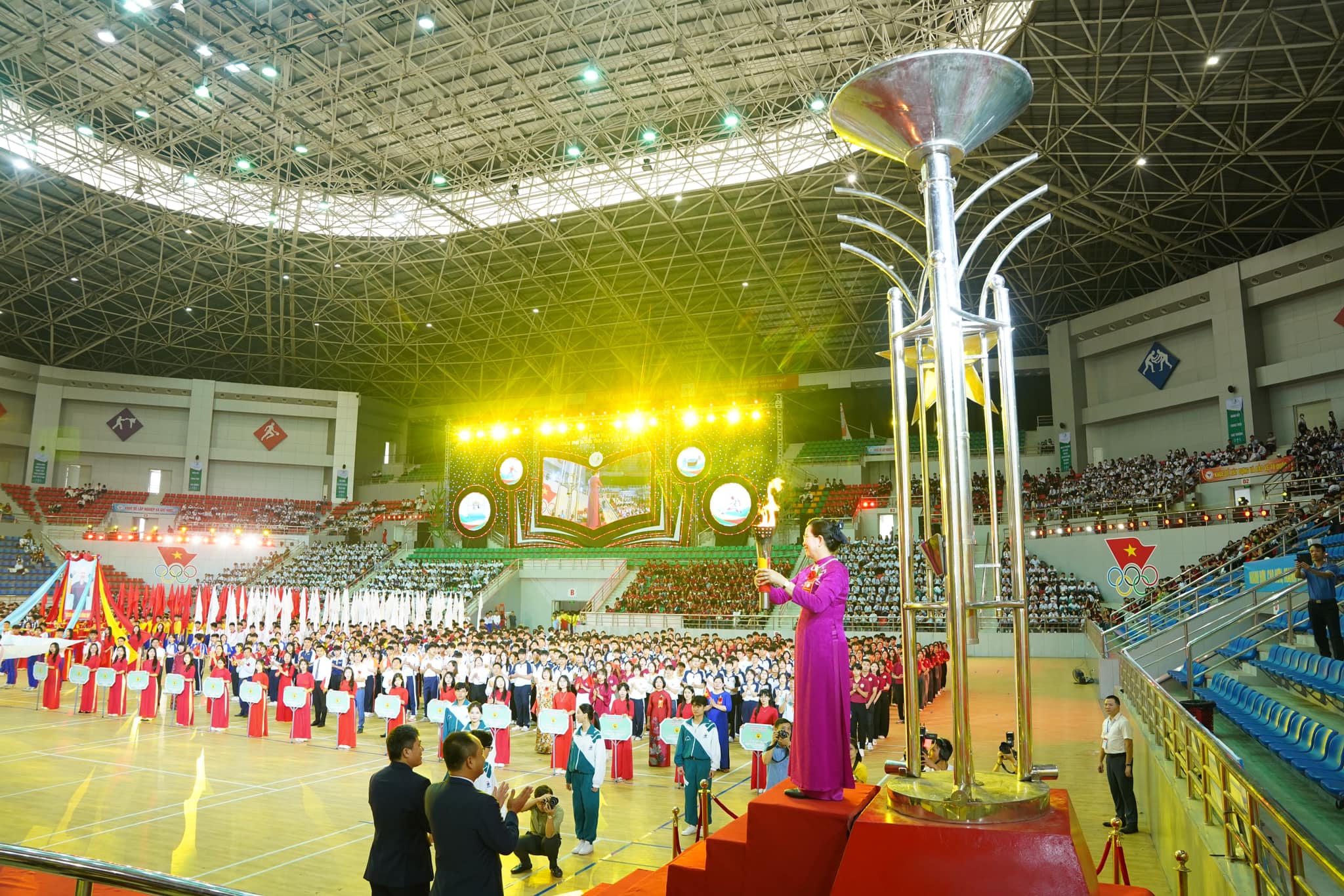 Bí thư Tỉnh ủy Lê Thị Thủy thắp sáng ngọn lửa khai mạc Hội khỏe Phù Đổng tỉnh lần thứ VII. |