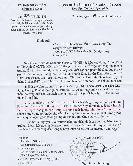 Ngày 3/4/2017, Chủ tịch UBND tỉnh Hà Nam đã có thông báo số 825/TB-UBND về việc chấp nhận chủ trương nghiên cứu, đầu tư dự án bê tông đúc sẵn và gạch không nung của Công ty Cường Phát. Trong thông báo này, UBND tỉnh Hà Nam xác định rõ vị trí sử dụng đất để xây dựng nhà máy mà doanh nghiệp đề xuất là lô đất liền kề với nhà máy gạch không nung và bê tông đúc sẵn của Công ty TNHH Vật liệu Bata. Ngay khi có thông báo chấp nhận chủ trương đầu tư của UBND tỉnh Hà Nam, Công ty Cường Phát đã bắt tay vào triển khai các công đoạn tiếp theo để triển khai dự án.