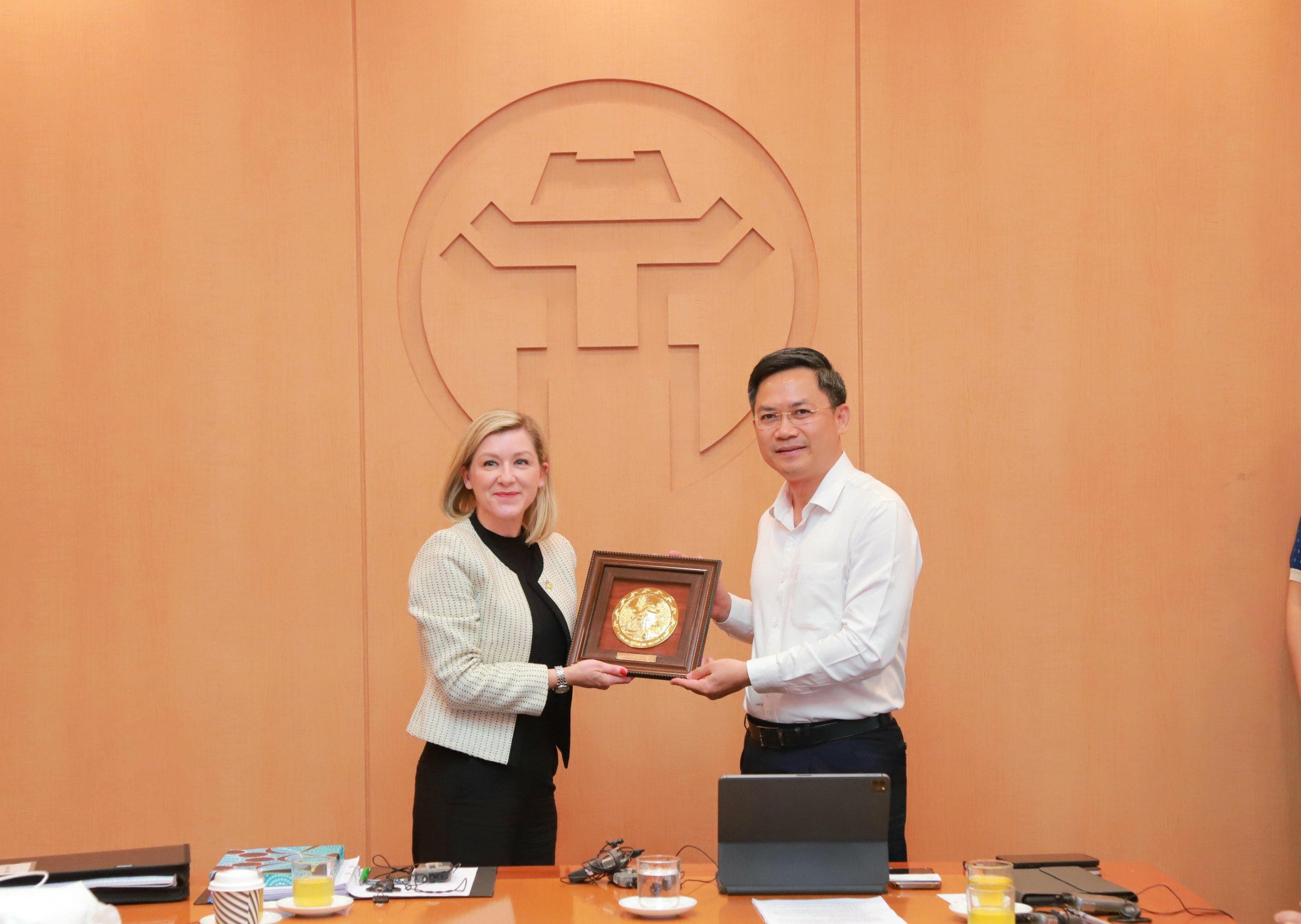 Phó Chủ tịch UBND TP Hà Nội Hà Minh Hải trao quà lưu niệm tặng Đoàn công tác. |