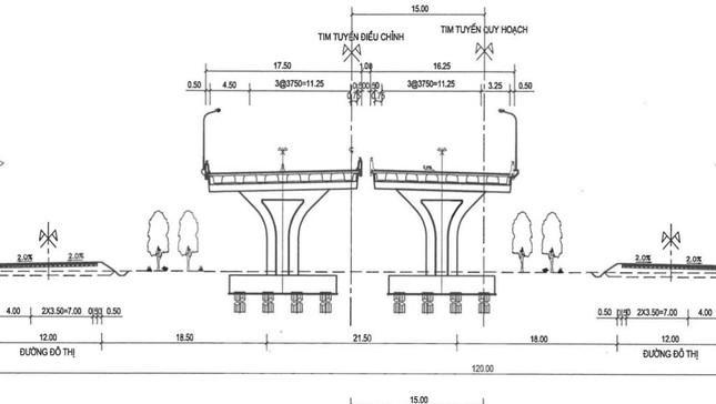 Bản vẽ mặt cắt ngang đường Vành đai 4, bao gồm đường cao tốc trên cao và đường đô thị đi bằng hai bên. |