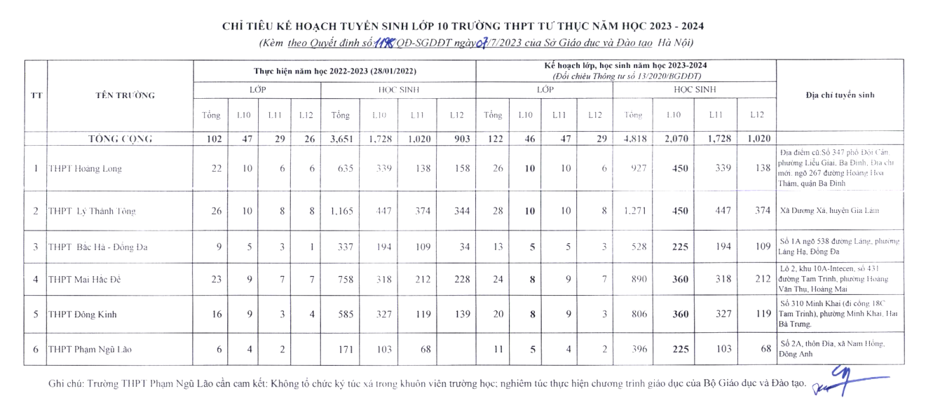 Cụ thể, Sở GD&ĐT Hà Nội giao chỉ tiêu tuyển sinh lớp 10 năm học 2023 - 2024 cho 6 trường THPT tư thục trên địa bàn tuyển 46 lớp với 2.070 học sinh.