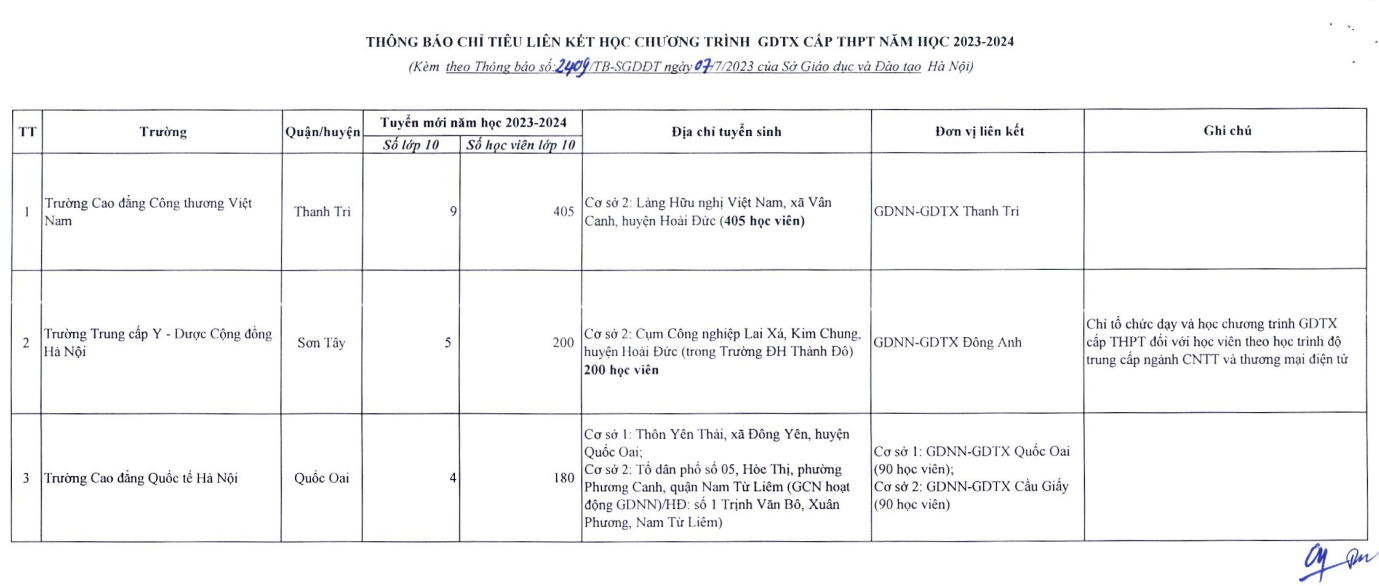 Sở GD&ĐT Hà Nội cũng vừa có thông báo về việc xác định chỉ tiêu học văn hóa chương trình giáo dục thường xuyên cấp THPT cho các trường trung cấp và cao đẳng trên địa bàn thành phố Hà Nội năm học 2023 - 2024 (đợt 2).