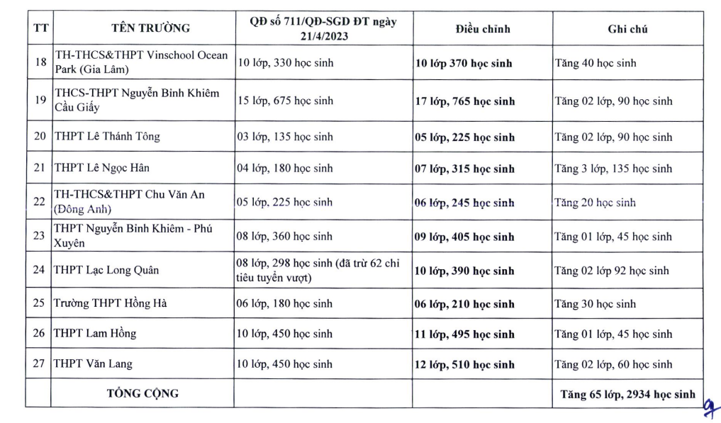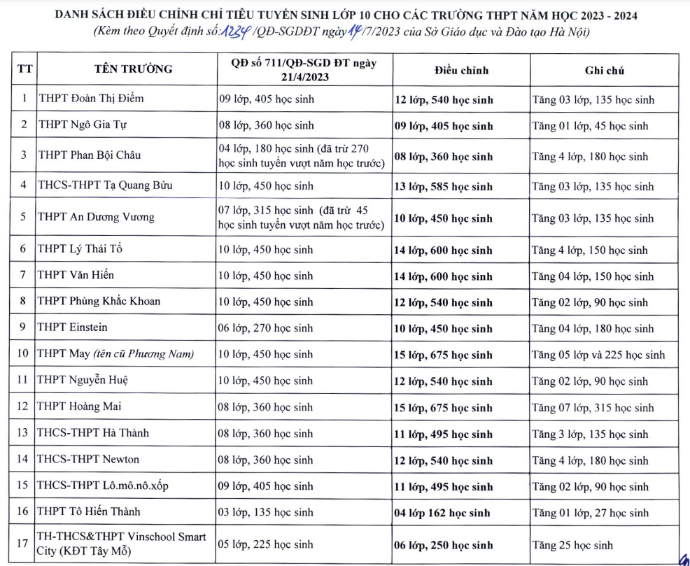 Theo đó, Sở Giáo dục và Đào tạo Hà Nội quyết định điều chỉnh chỉ tiêu tuyển sinh cho 27 trường THPT tư thục được bổ sung thêm 65 lớp với 2.934 học sinh. Cụ thể, Trường THPT Phan Bội Châu tăng 4 lớp với 180 học sinh, THPT Đoàn Thị Điểm tăng 3 lớp với 135 học sinh, THPT Nguyễn Huệ, THPT Nguyễn Bỉnh Khiêm... tăng 2 lớp với 90 học sinh...