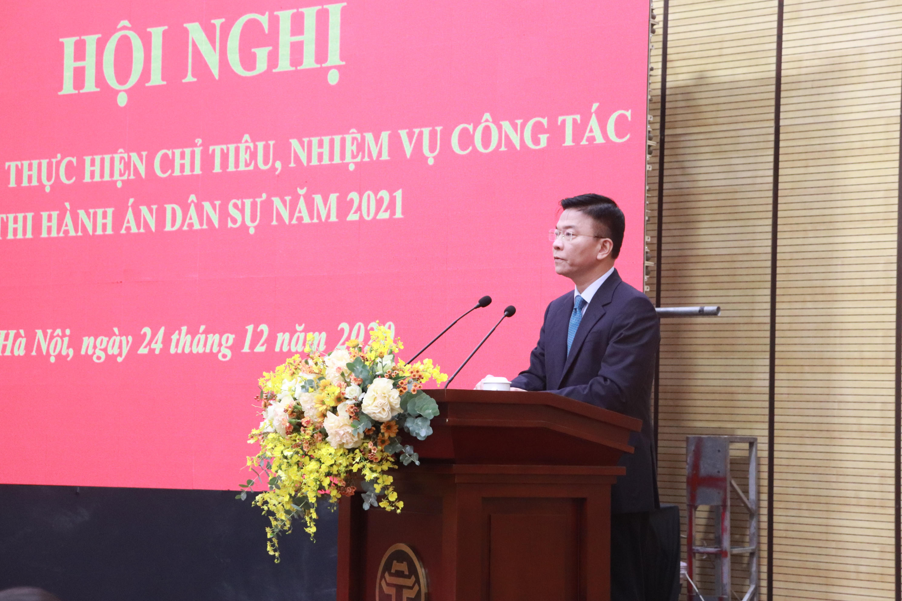 Phát biểu chỉ đạo, Bộ trưởng Lê Thành Long nhận định năm 2021 công tác THADS trên địa bàn Thủ đô sẽ phải đối mặt với nhiều khó khăn, thách thức khi lượng việc và tiền có xu hướng tăng. Vì vậy, Bộ trưởng đề nghị các cơ quan THADS cần tiếp tục bám sát sự lãnh đạo, chỉ đạo, điều hành của cấp ủy, chính quyền địa phương các cấp. Ngay từ đầu năm, phải xác định được các nhiệm vụ ưu tiên để tập trung triển khai, từ đó góp phần hoàn thành các chỉ tiêu, đặc biệt là chỉ tiêu về việc và tiền.