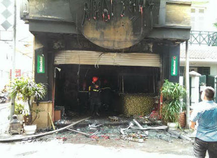 Vụ cháy được phát hiện vào khoảng 12h trưa nay. Theo quan sát ngôi nhà dùng làm quán karaoke này có 4 tầng và một tum nằm trên diện tích đất khoảng 100m2. Đám cháy khiến toàn bộ quầy bar cùng tầng 1 của ngôi nhà, biển quảng cáo phía trước bị ngọn lửa thiêu rụi.