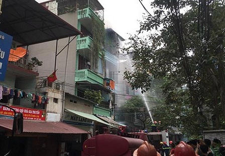 | Ngọn lửa bùng phát ra từ tầng 4 của ngôi nhà số 26, ngõ 281 Trần Khát Chân và lan sang các ngôi nhà bên cạnh. |