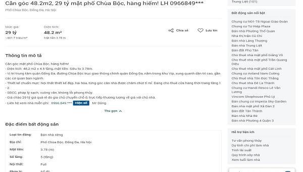 Thậm chí, có một căn nhà diện tích 48,2m2 được rao bán với giá lên tới 29 tỷ đồng, tương đương mức giá 601,7 triệu đồng/m2. Căn nhà này được mô tả có mặt tiền siêu to, lên tới 3,78m, nội thất bên trong được thiết kế đẹp, hài hòa và tầng 1 đang được cho thuê làm cửa hàng thời trang.