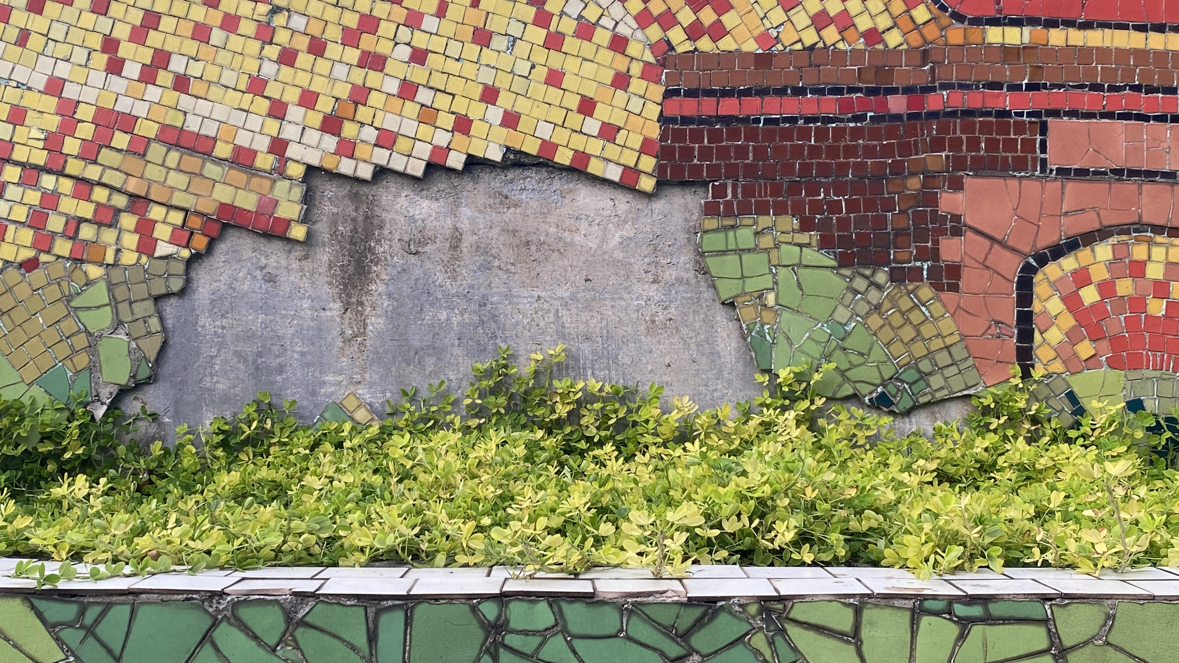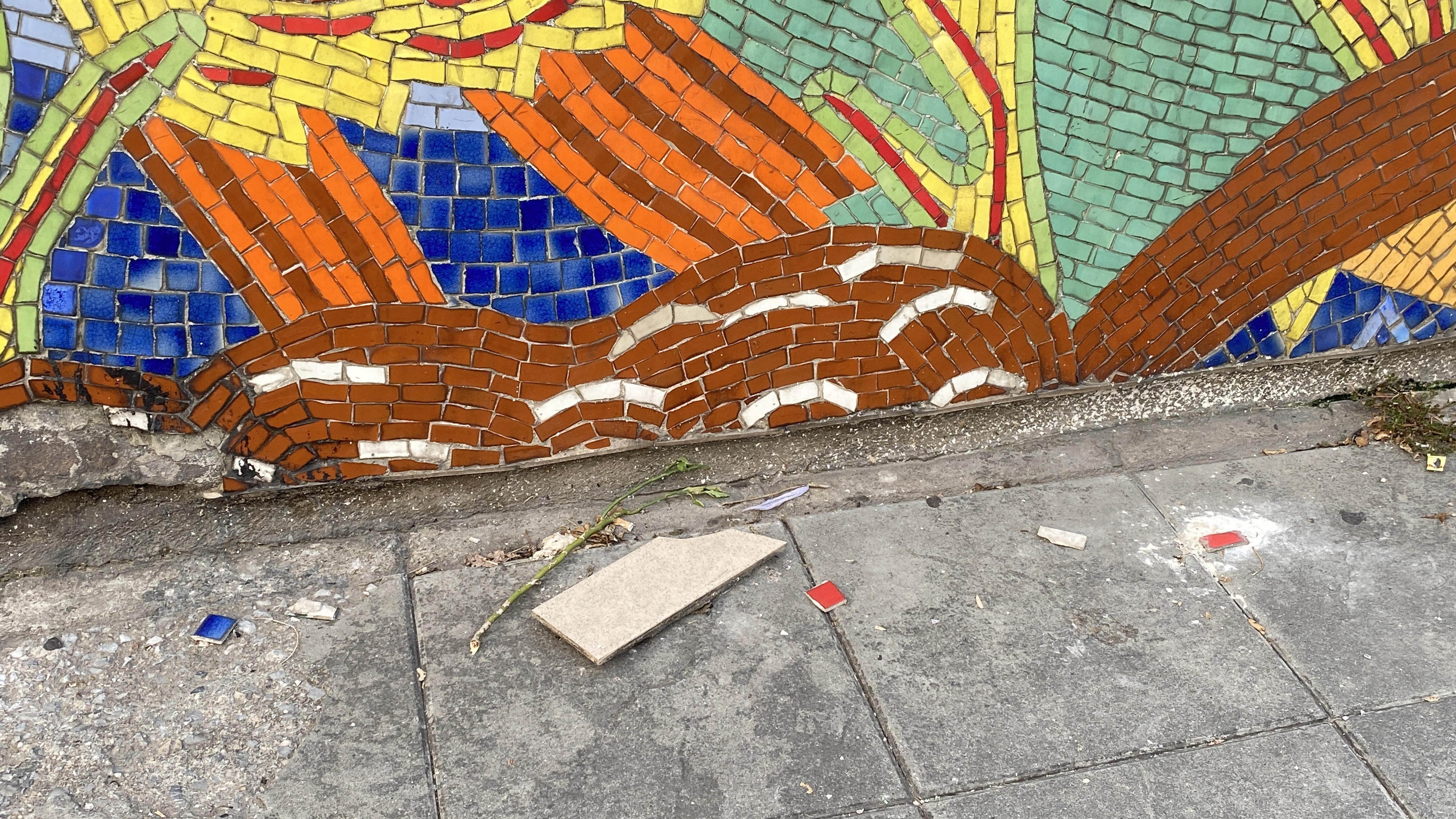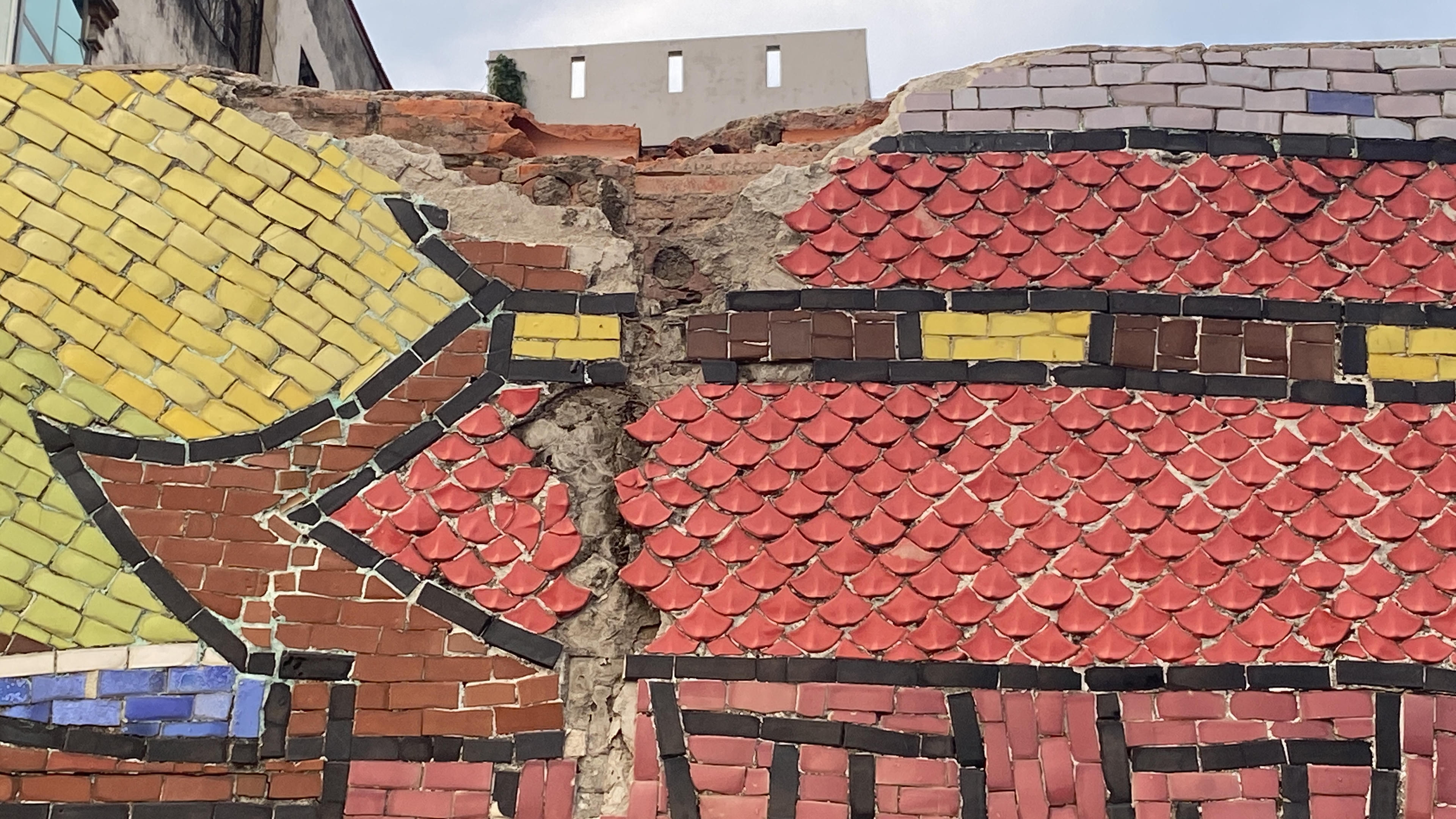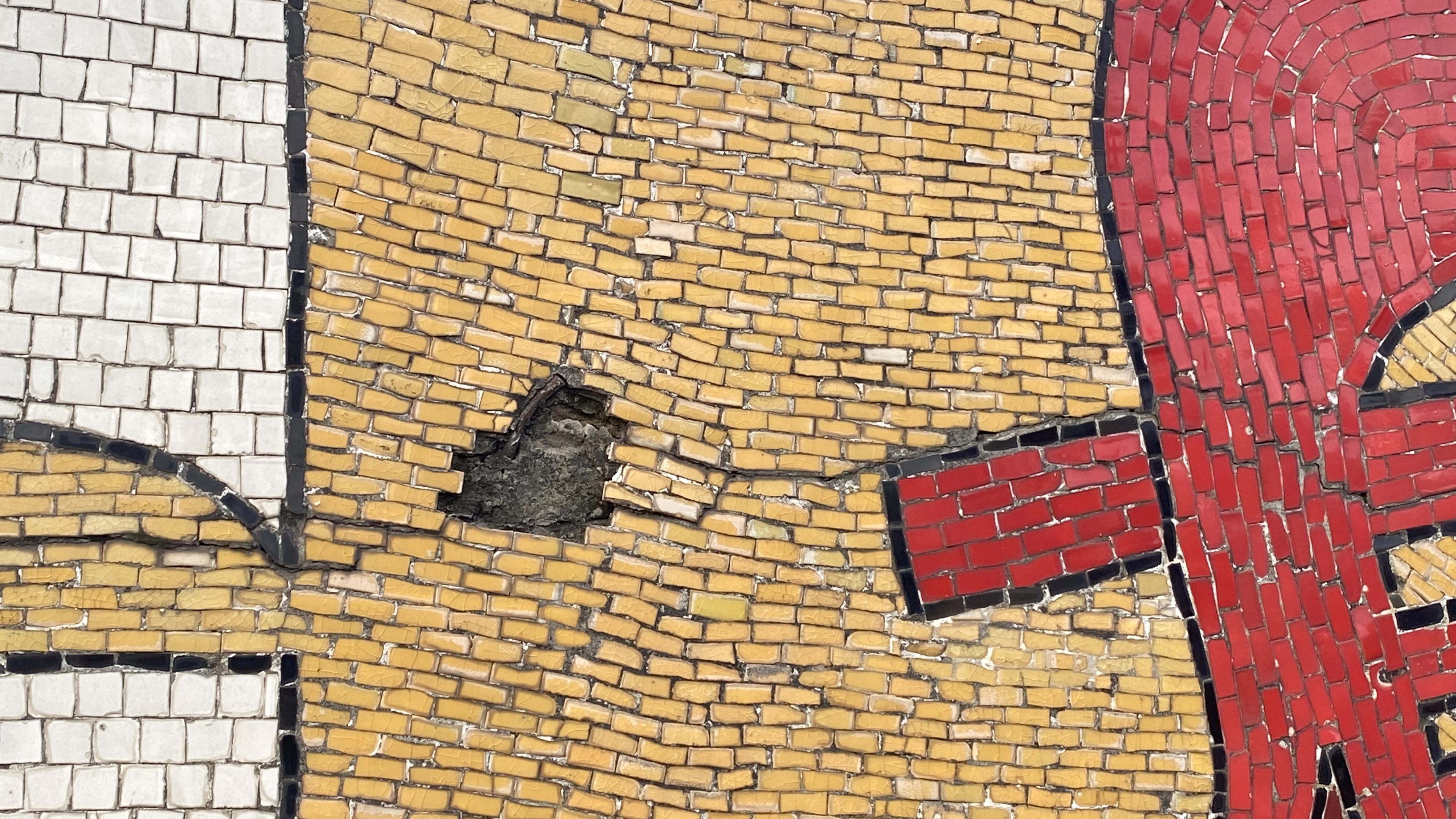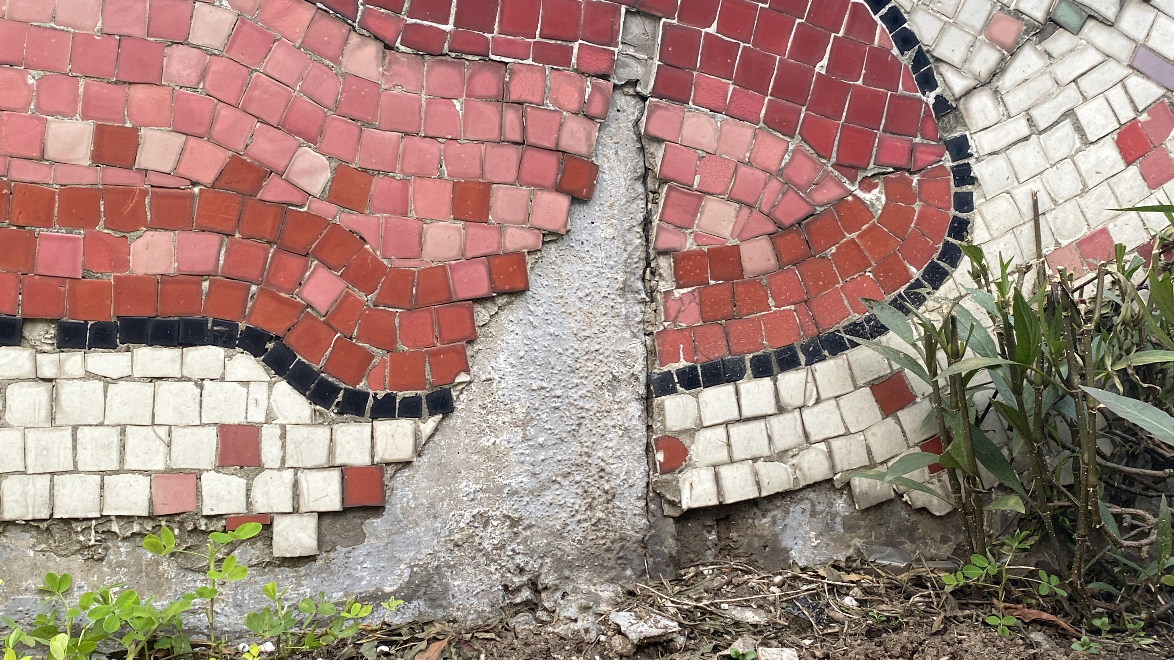 Bức tranh gốm bị trơ phần gạch đỏ. |