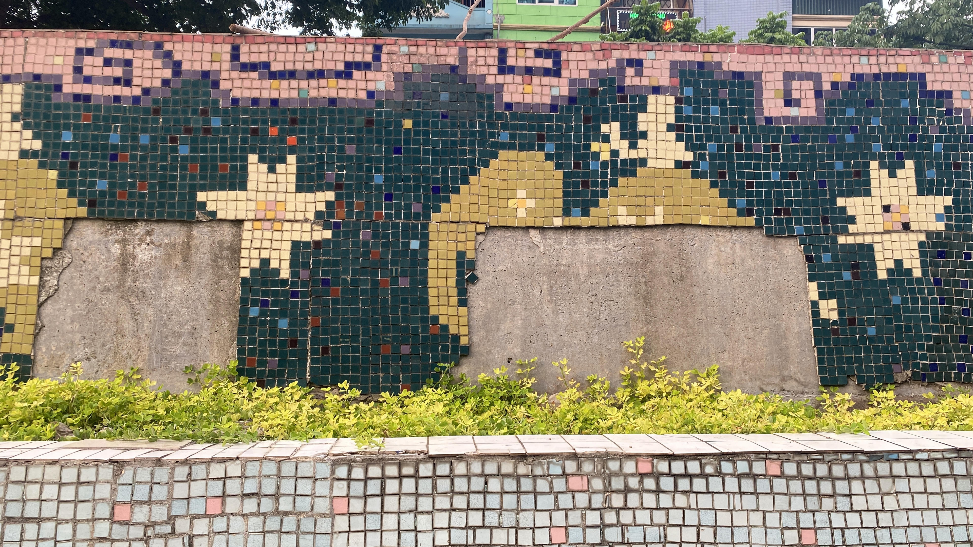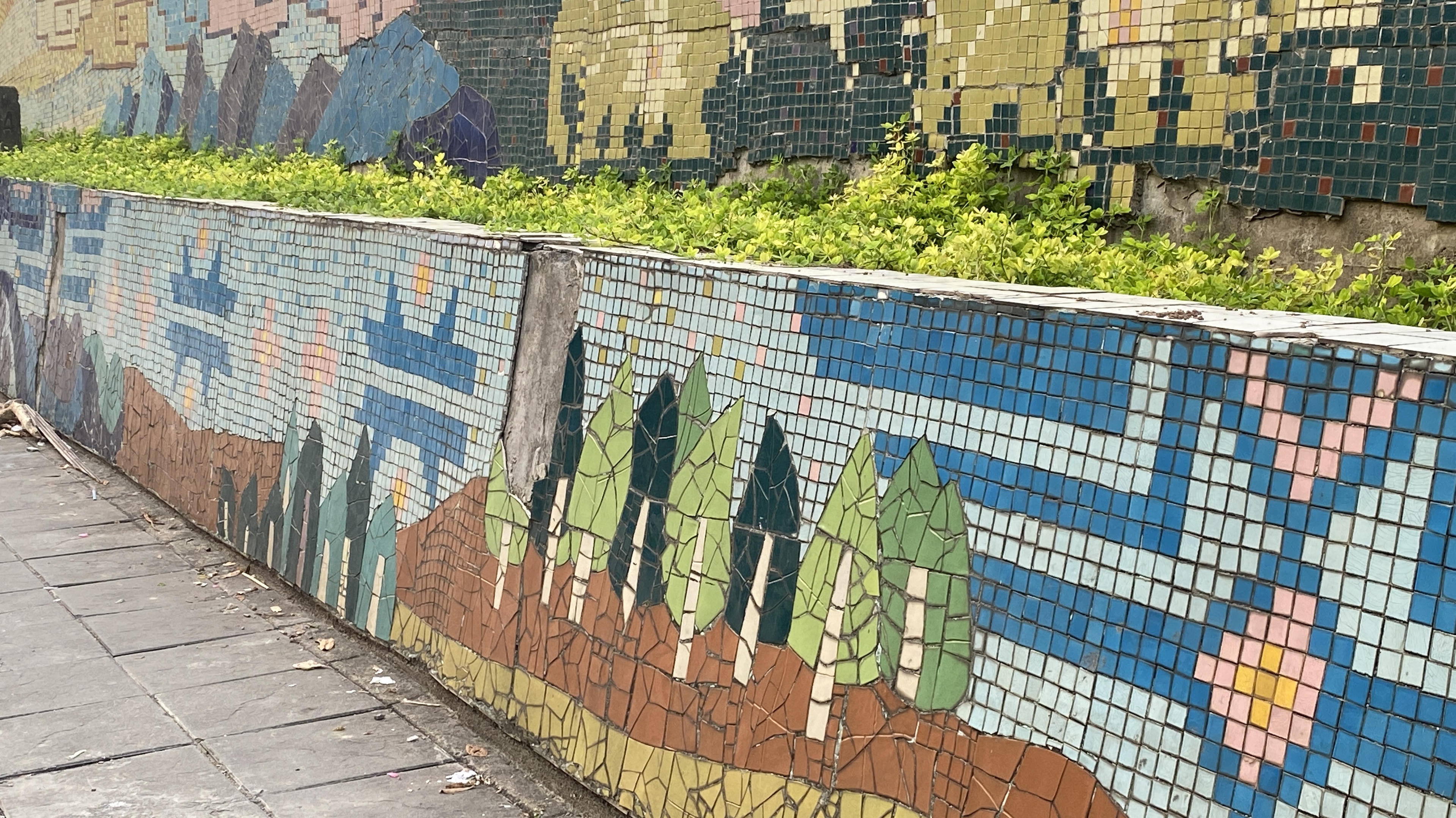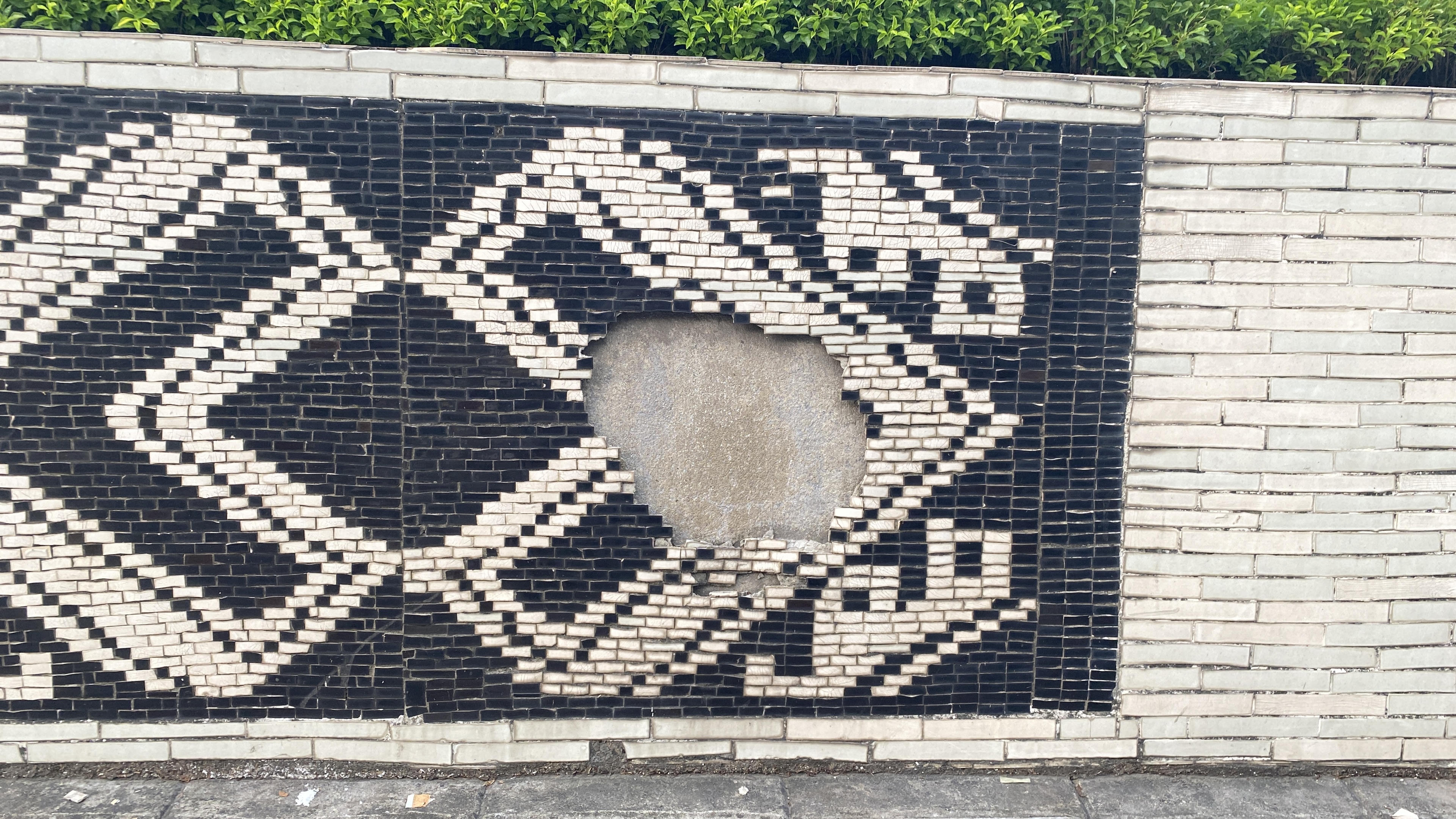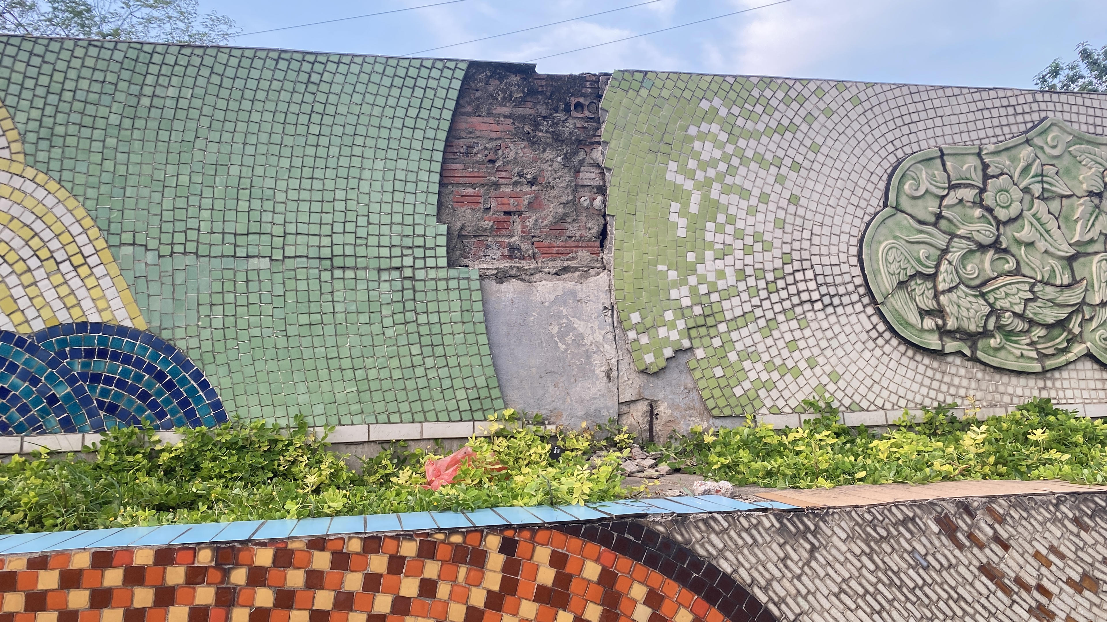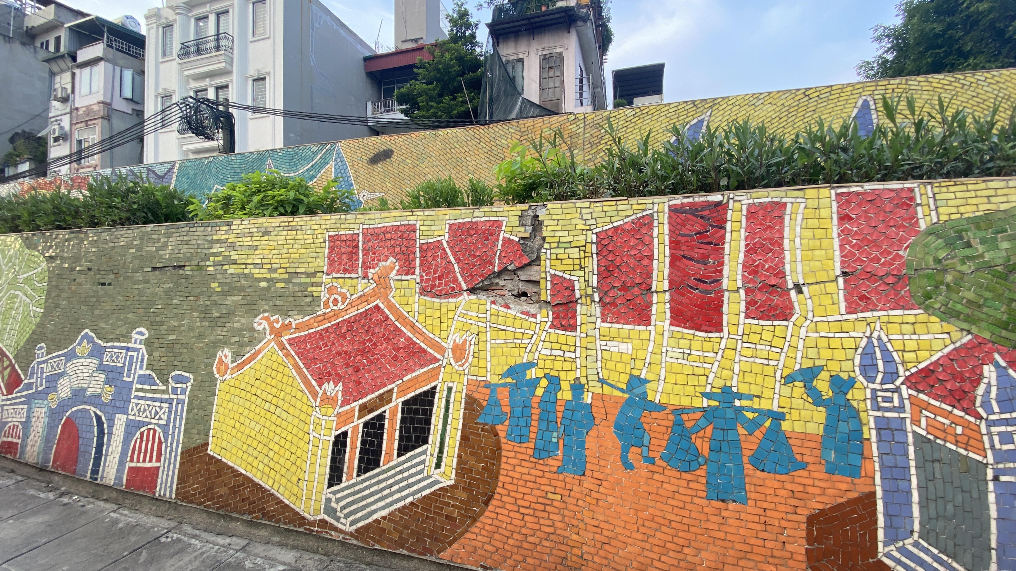 Con đường gốm sứ gắn bó với Hà Nội 13 năm, tuy nhiên đến nay mặt tường đã bong tróc, xuống cấp do lâu ngày không được trùng tu, cải tạo. |