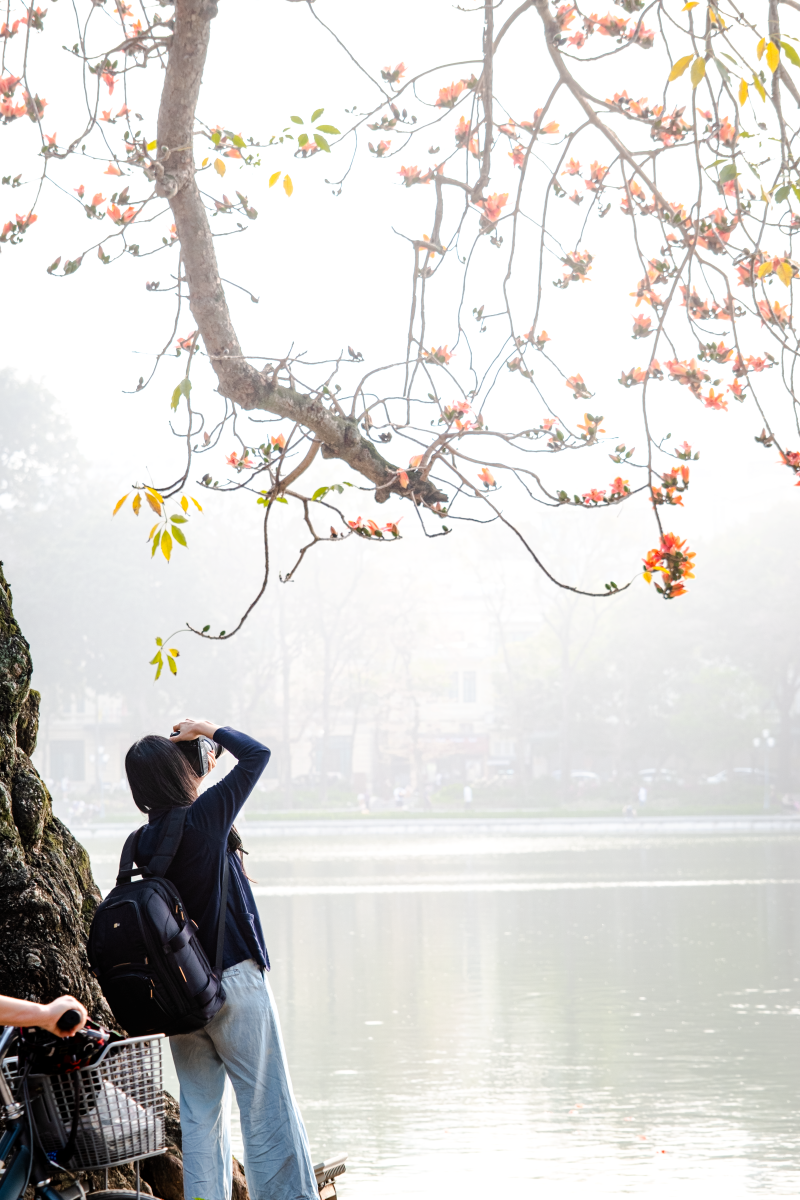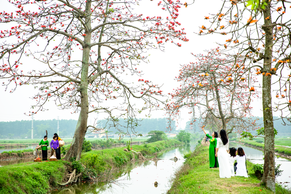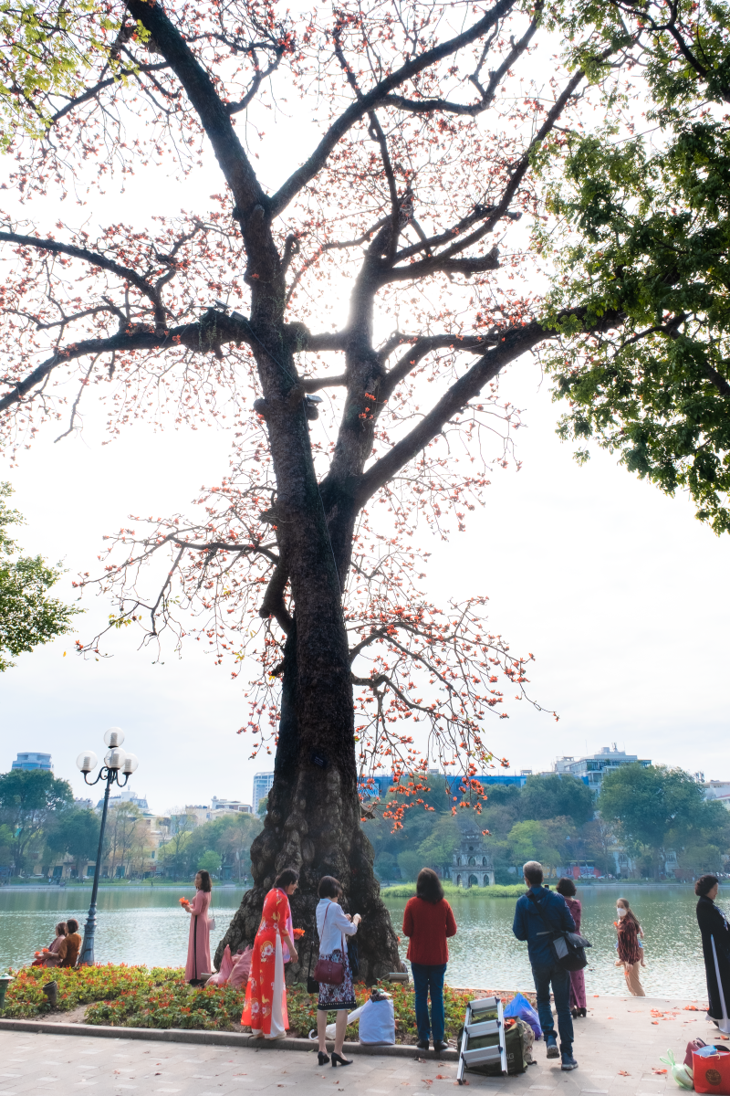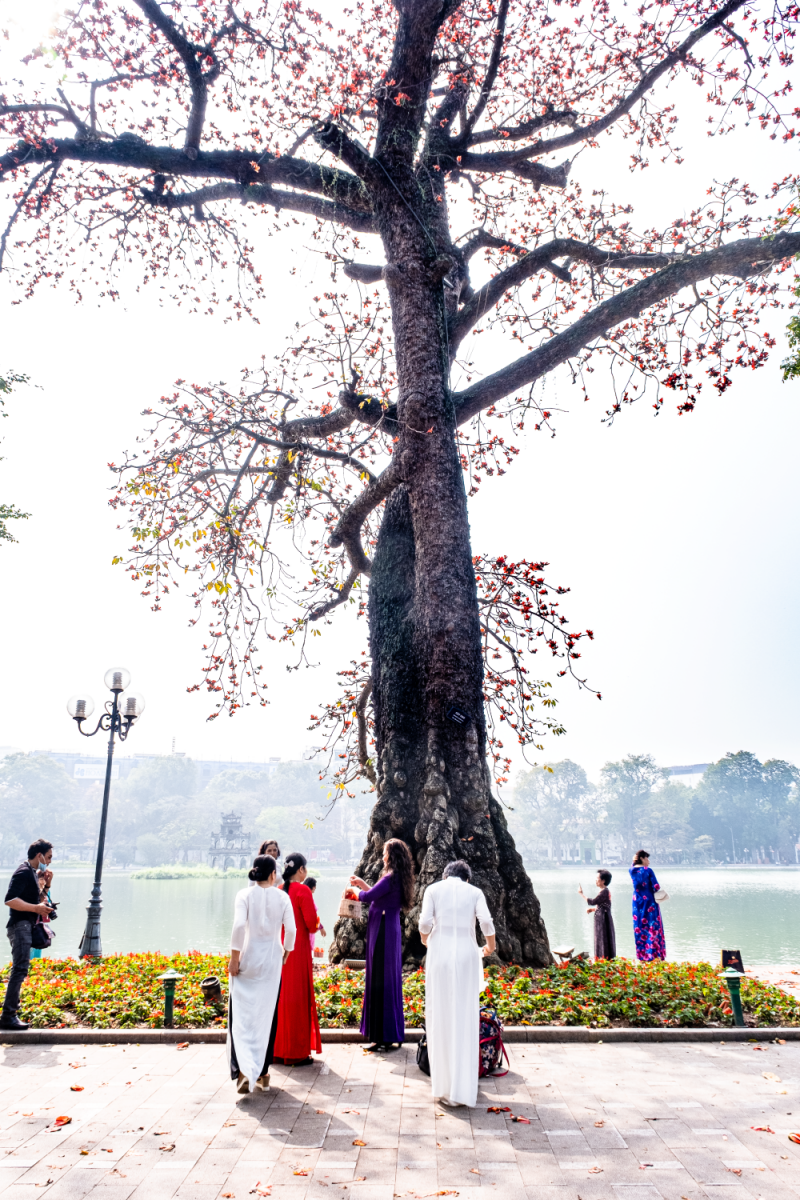Ngày thường, chỉ riêng cái gốc gạo cổ xù xì thân mấu với những u cục nổi vồng lên đã đủ thu hút chị em với tà áo dài thướt tha đến tạo dáng. Đến mùa hoa nở, gốc hoa đỏ rực những bông gạo rụng xuống lại càng thu hút người người đến check-in. Những năm trước, cây gạo này chỉ sai hoa trên ngọn và tán lưng chừng cây nên ít người phát hiện ra và cũng rất khó để check-in. Hoặc có năm cành rủ thấp ra hoa nhưng lại cũng rất nhiều lá nên che lấp mất. Riêng năm nay, những cành gạo phía hồ vươn dài ra, rủ thấp la đà, đã thế lại rất sai hoa và hầu như không còn chiếc lá nào đã tạo nên phong cảnh hữu tình thẫm đẫm hồn cốt một Hà Nội nghìn năm văn hiến nên lúc nào cũng đông nghịt người…